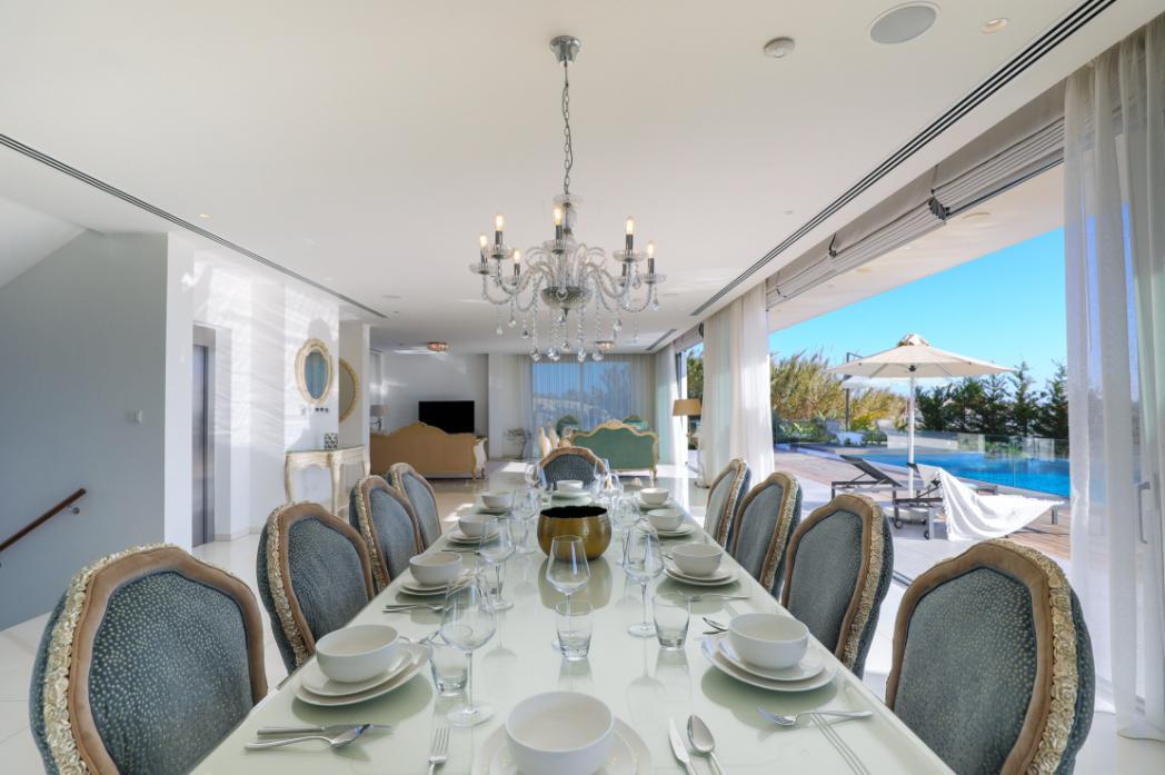 On the first line of the coast, just 50 meters from the warm waves of the Mediterranean Sea, there is an exclusive 5-bedroom villa with a total area of 650 m2, a swimming pool, and a garden, accommodating up to 10 guests.