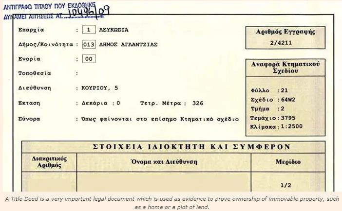 Nevertheless, a Title Deed is a very important legal document which is used as evidence to prove ownership of immovable property, such as a home or a plot of land. With regards to immovable property, the Department of Lands and Surveys in the Republic of Cyprus is the only public department in Cyprus that is involved with the rights related to immovable property and a Title Deed needs to be officially registered with this Department.