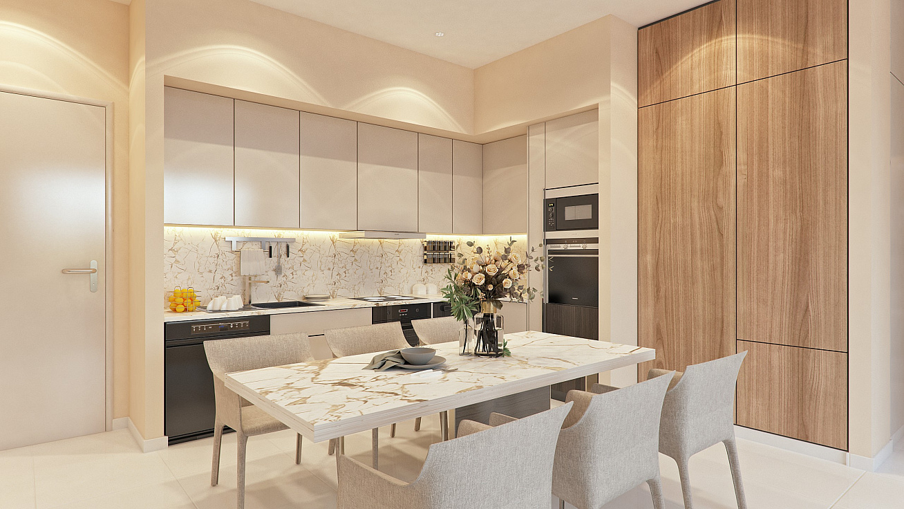 The apartment has an open plan kitchen and living room, as well as a covered veranda. Each apartment also has its own parking space and storage room, which will provide additional convenience for storing things. The penthouses have their own roof garden.