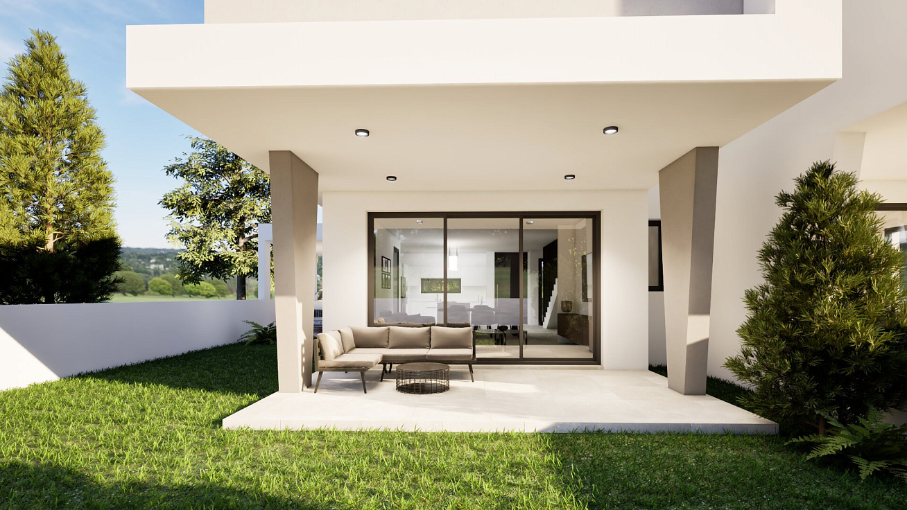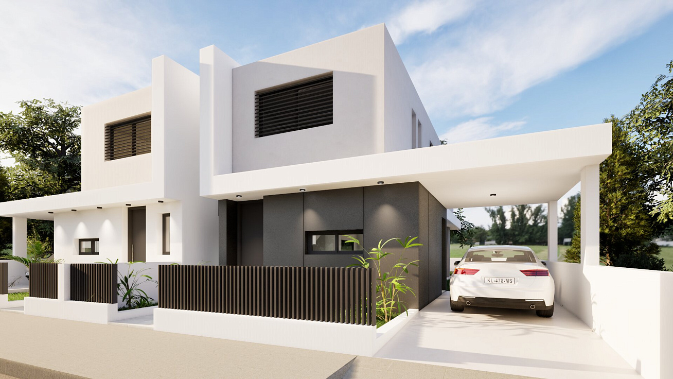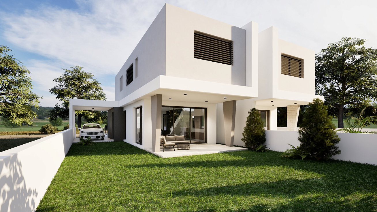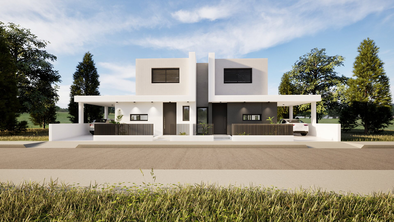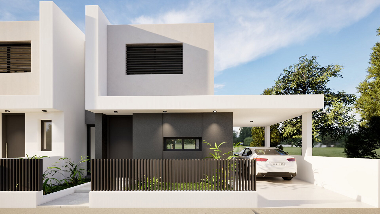 Residential complex in Deftera Pano, Nicosia. There are only two houses in the complex. The project includes an open-plan kitchen and living room, three spacious bedrooms and a covered veranda. There is a covered parking for the car.