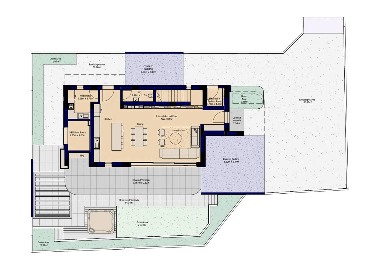 The new residential complex of detached houses in Ypsonas, Limassol is a modern project combining style, comfort and innovative technologies. The complex is designed in a minimalistic architectural style with an emphasis on energy efficiency and environmental friendliness. Each house has a well-thought-out layout with spacious open-plan living rooms, Italian kitchens and private gardens where you can arrange a swimming pool, pergola and relaxation area.