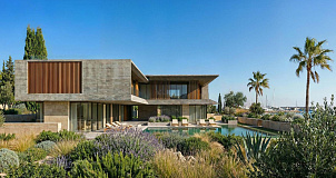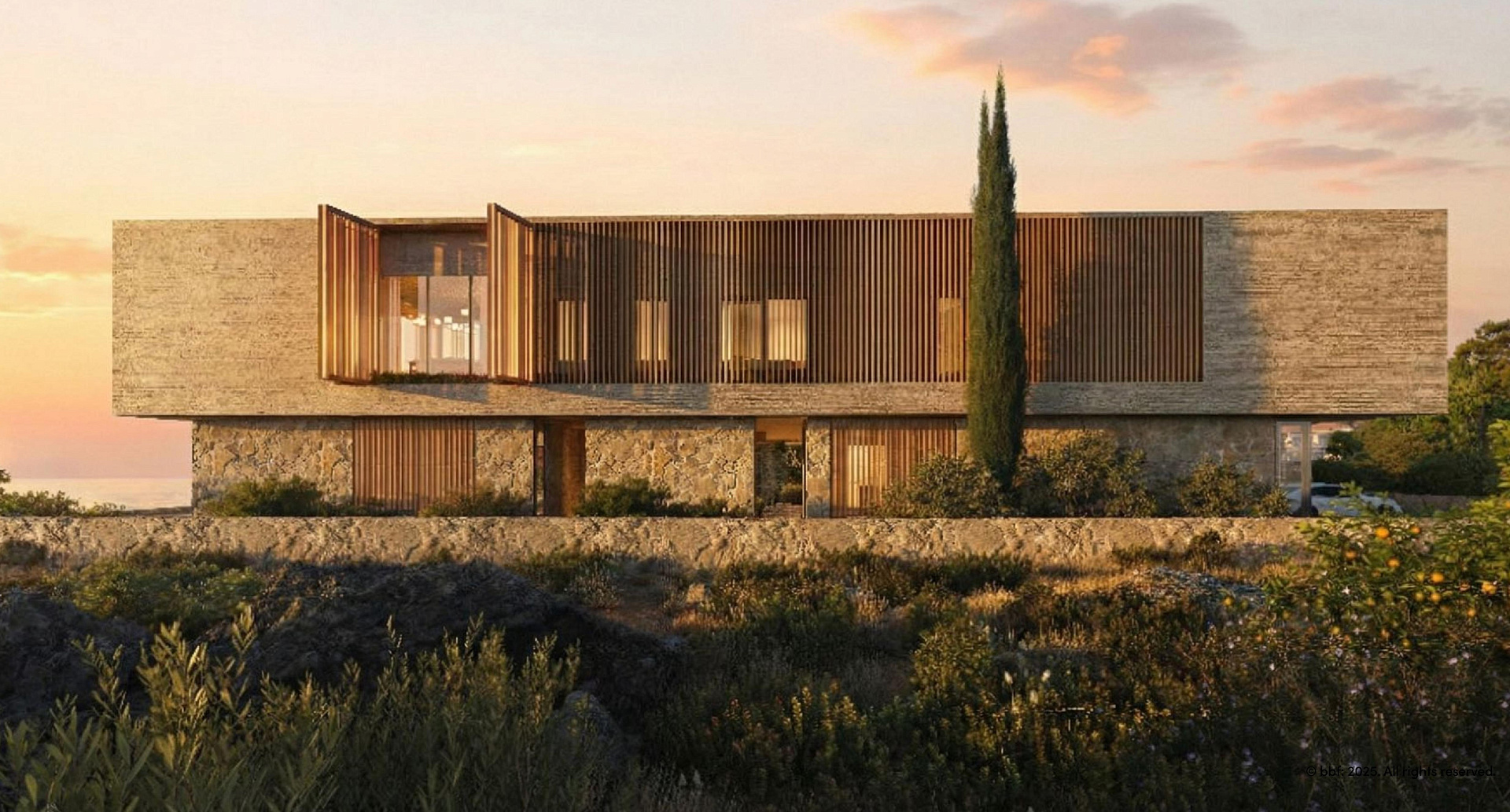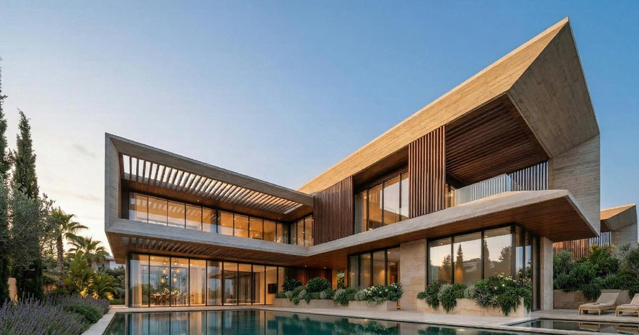 New luxury 5 bedroom villa in the area of Pareklissia, Limassol, located in an exclusive coastal complex. The villa features modern architecture, where natural stone and wooden elements blend harmoniously with panoramic floor-to-ceiling glazing, creating a sense of space and light.