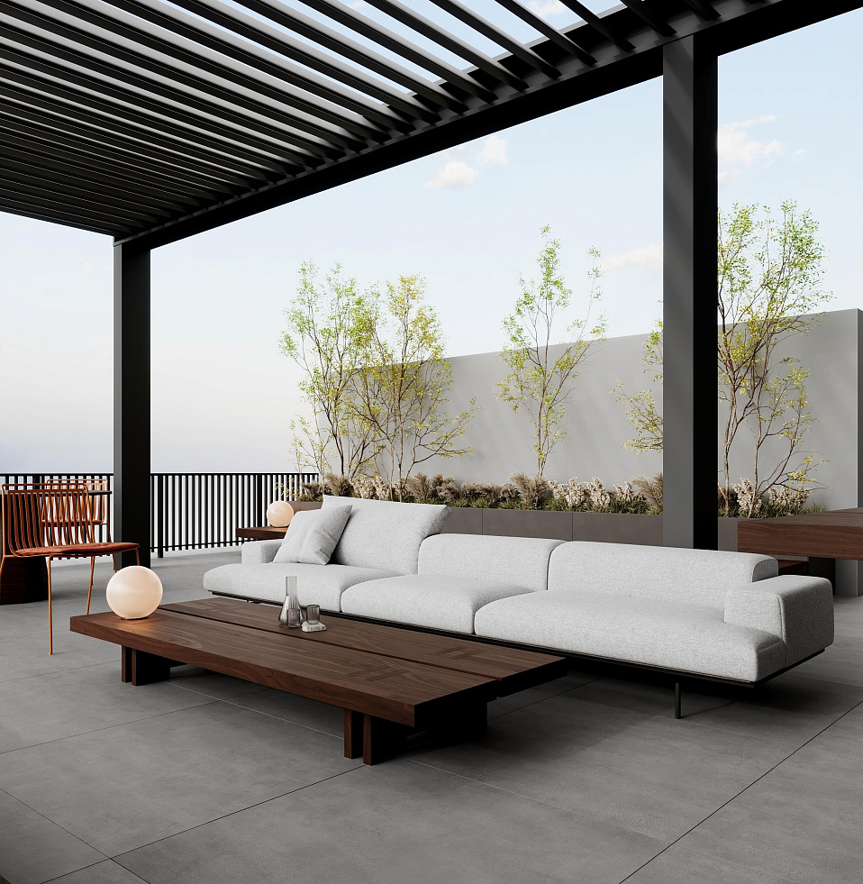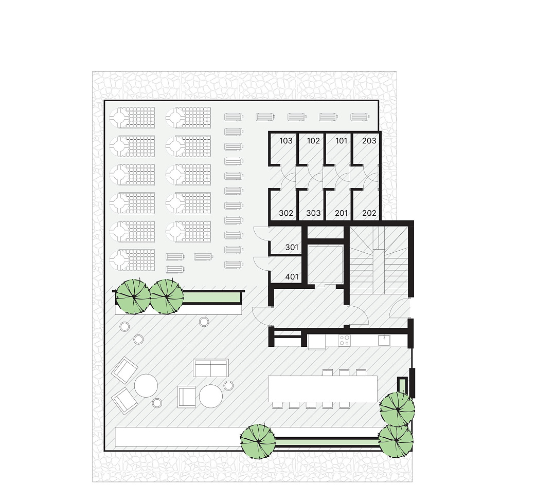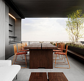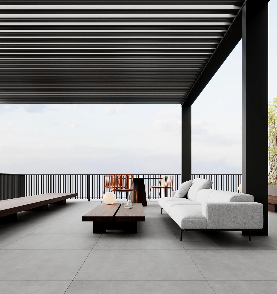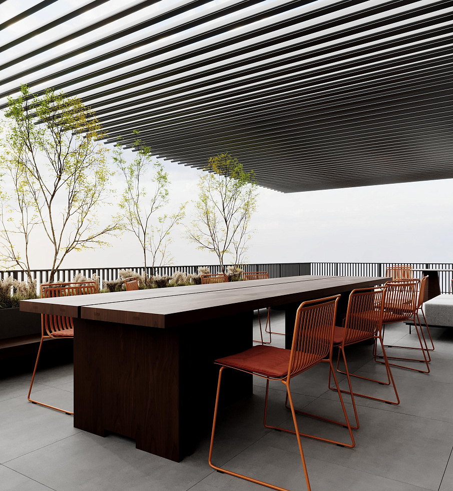 There is a fully covered common space on the upper floor, divided into two zones: one of them is a gym, and the other is a social area with cooking and relaxation areas.