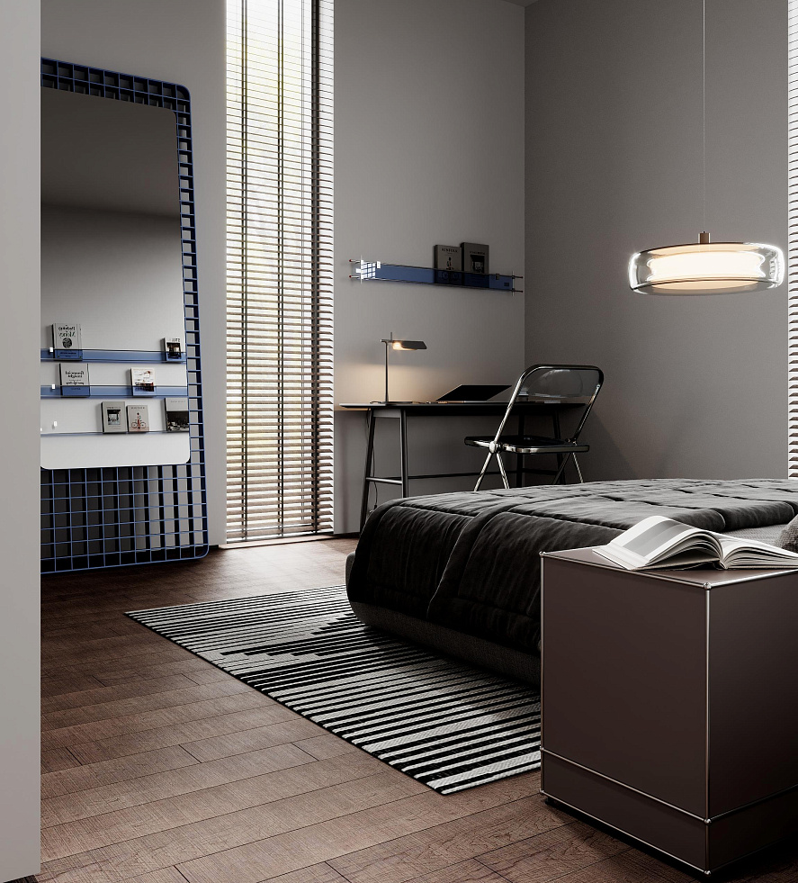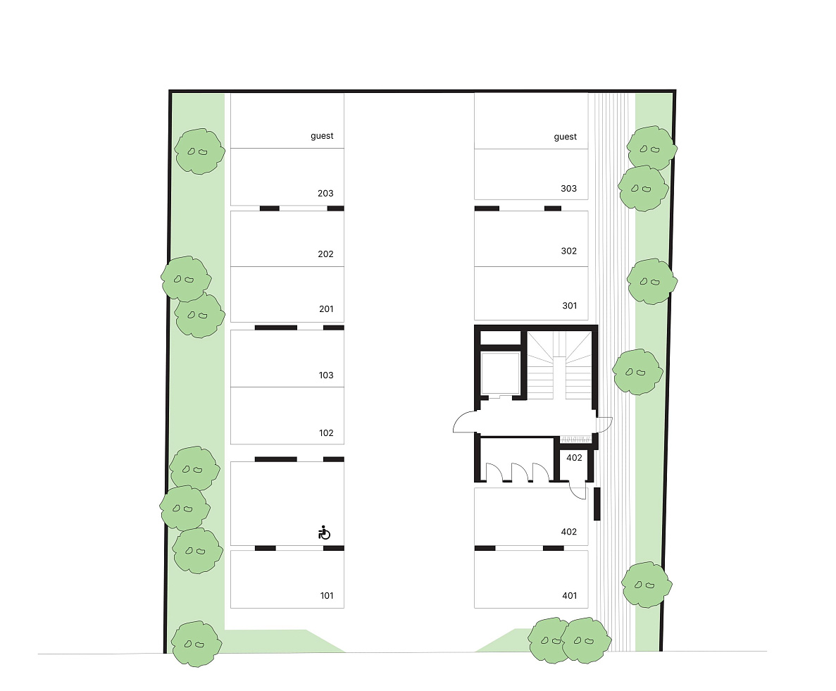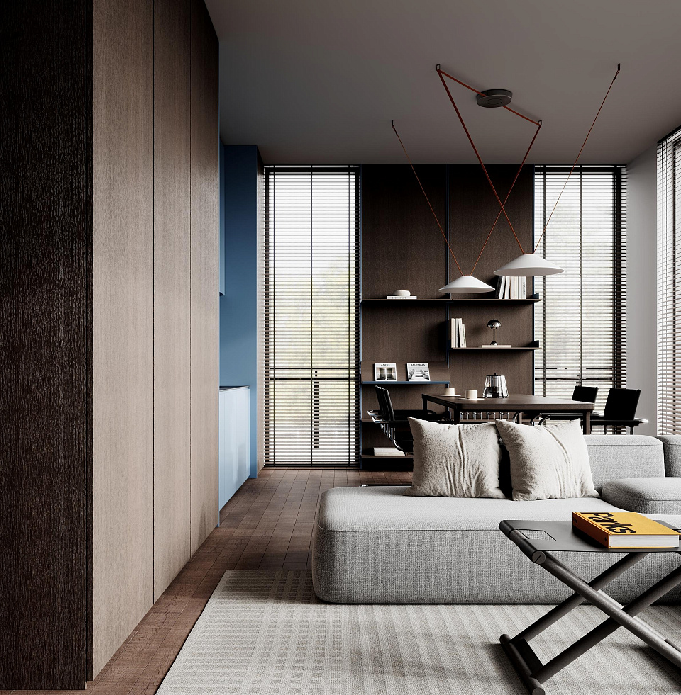 There is a fully covered common space on the upper floor, divided into two zones: one of them is a gym, and the other is a social area with cooking and relaxation areas.