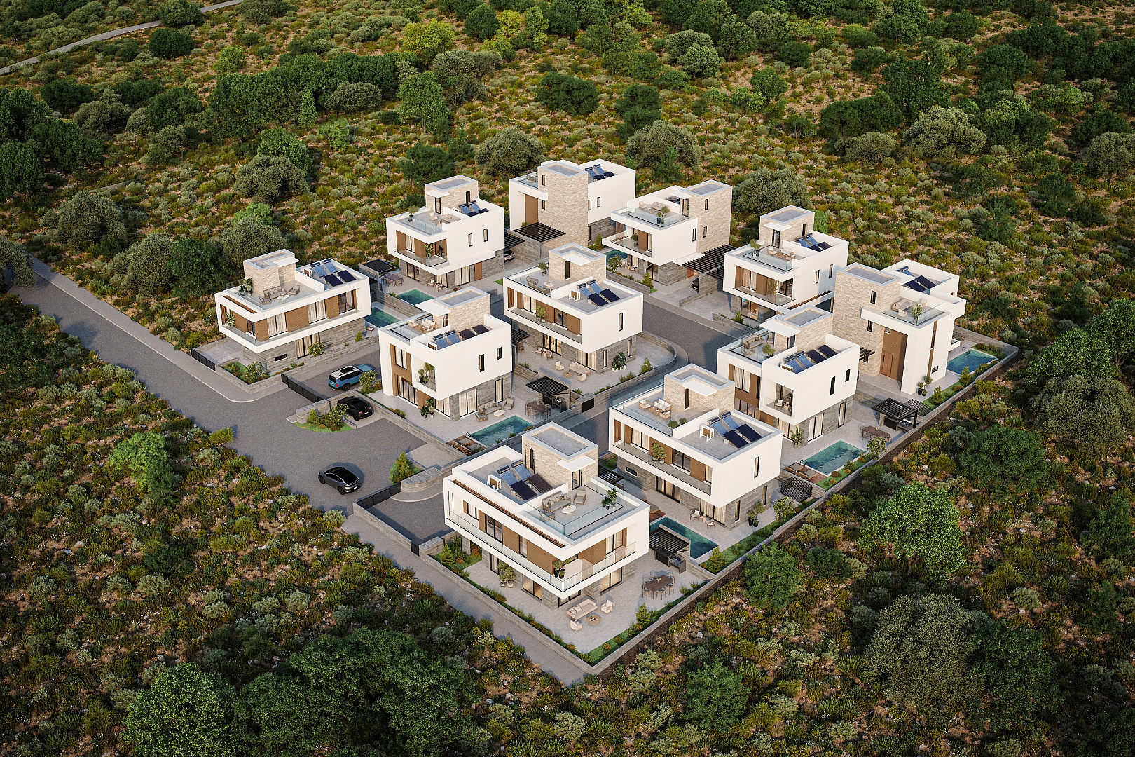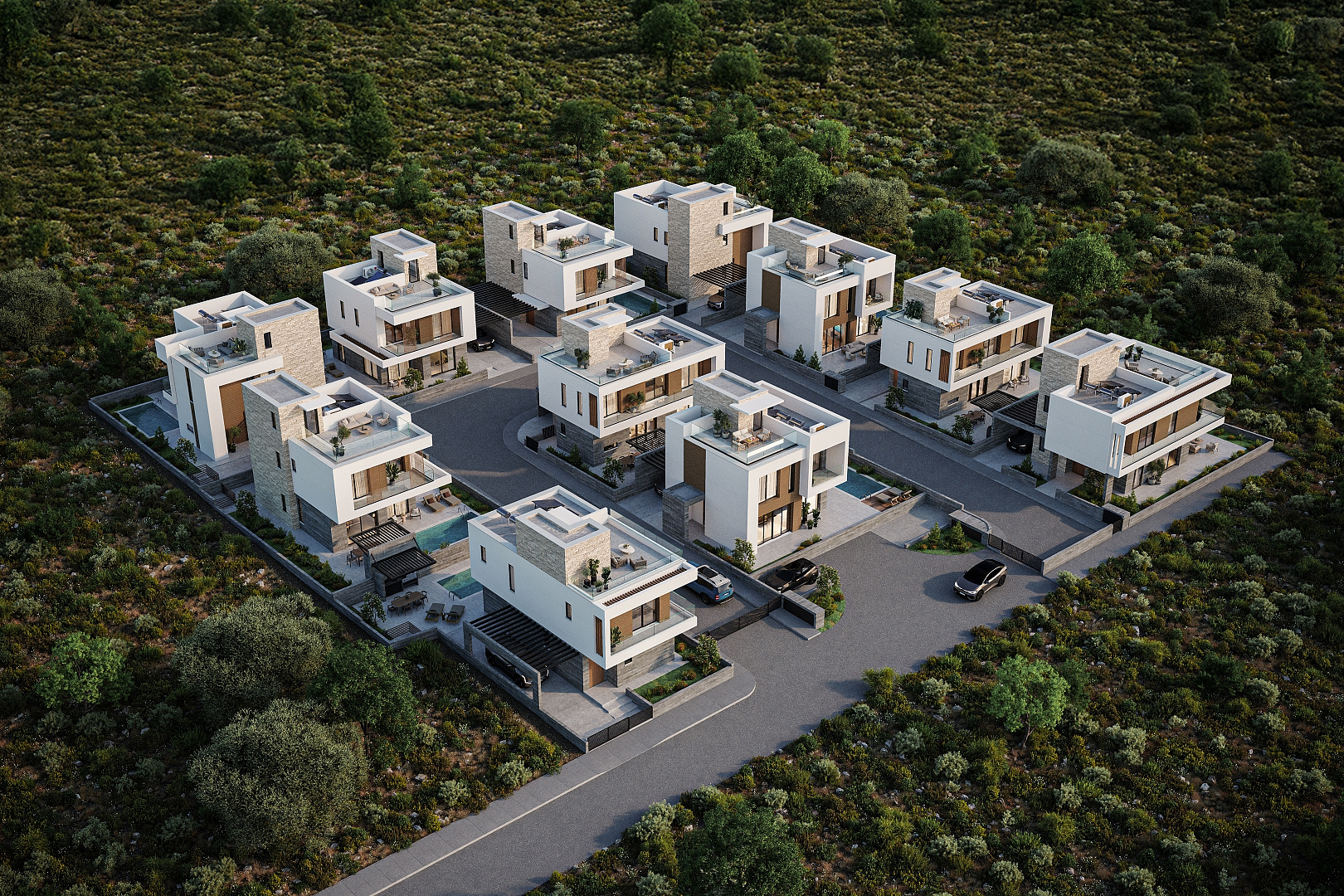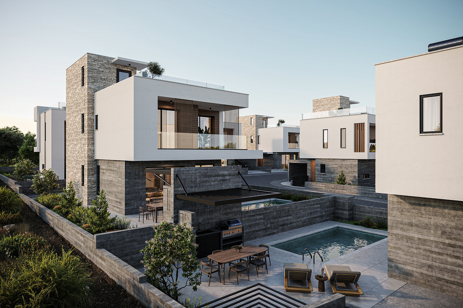 The complex includes modern 3 and 4 bedroom villas, designed with an emphasis on comfort, functionality and modern design. Each house is equipped with a private roof garden, creating an ideal space to relax and enjoy the panoramic views.