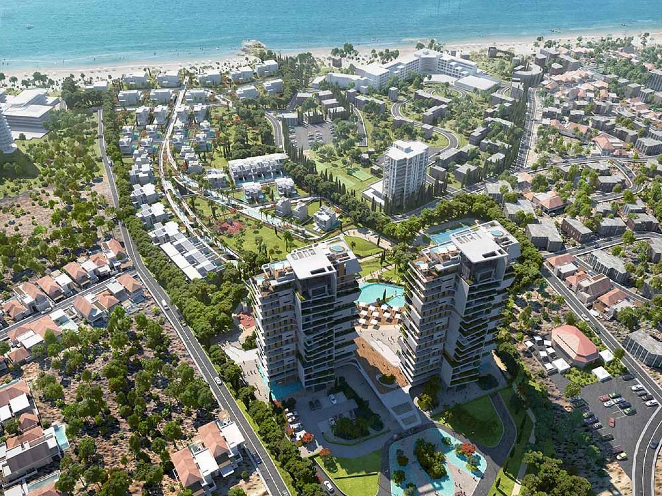 The grandiose complex is being built in the tourist area of Pyrgos, on the first coastline, surrounded by luxury 5-star hotels: Parklane, Luxury Collection Resort and Spa and Sofitel. It will consist of a luxury hotel block comprising a west wing and an east wing. The two buildings, each 36.5 meters high, will house a total of 300 rooms. In the eastern wing, in addition to the hotel block, a 16-story tower with 40 apartments will be built. Of these: 9 will be with one bedroom, 14 - with two, 16 - with three, as well as 1 luxury penthouse. The total height of the building will be 109 meters.
