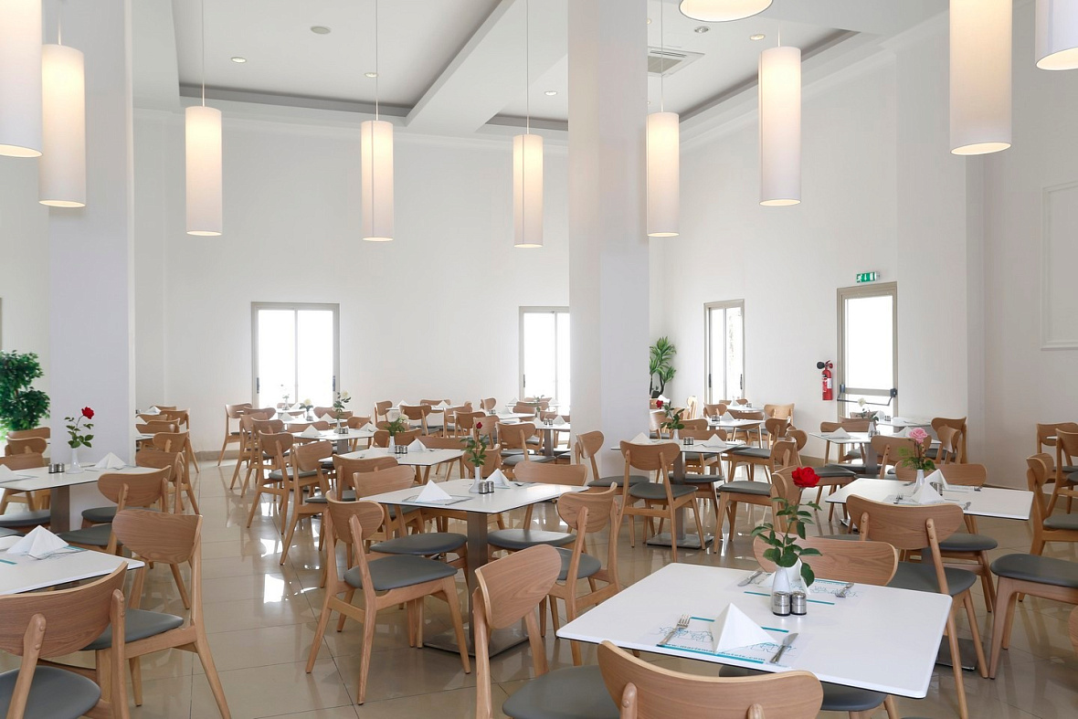 The luxurious hotel is situated in a beautiful location next to Coral Bay, just ten metres from the sea and the beach. The hotel has 149 rooms, including 75 suites and 74 superior rooms. The comfortable rooms overlook the grounds and have side and direct sea views.