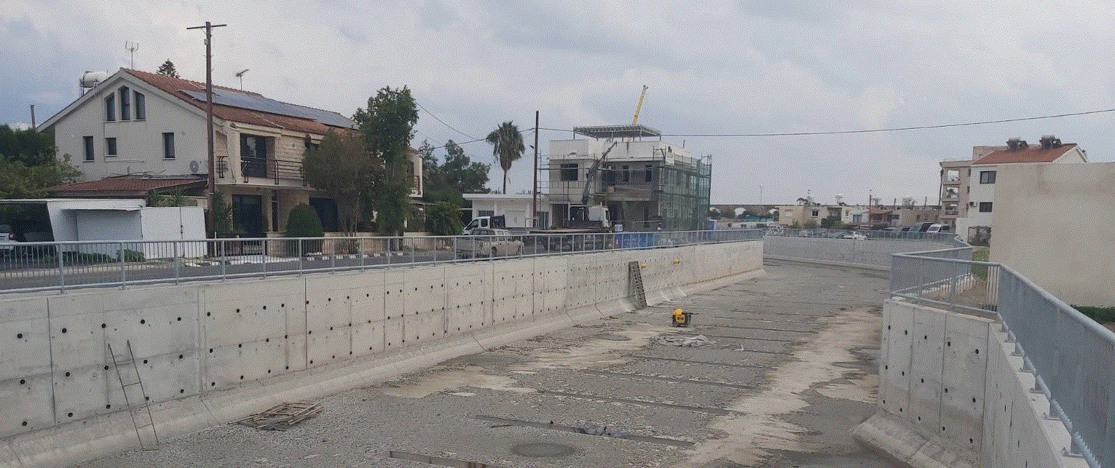 The Kamares project is considered one of the most modern and technically advanced flood protection facilities ever implemented in Cyprus. The open channel is being significantly widened, providing greatly increased flow capacity. Upstream from Diadon Street, the existing channel is being dismantled and replaced with a new open rectangular channel, lined with concrete and located at a lower level.