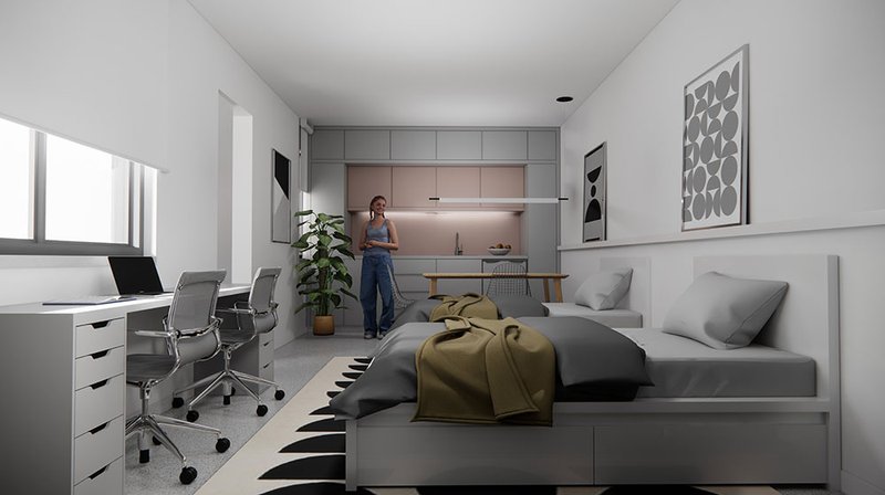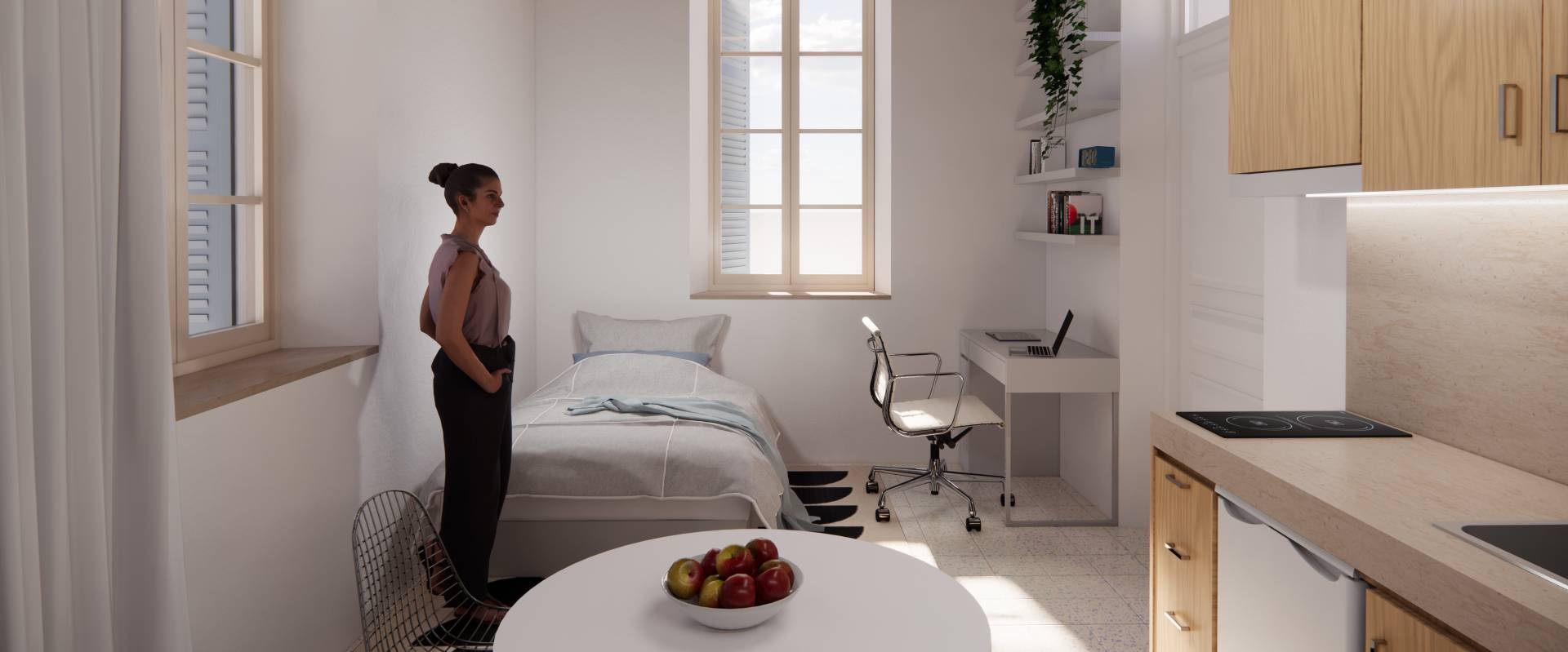 The project will equip 20 rooms of 28 m2 each. All rooms will meet the requirements of accessibility for people with disabilities. Each room will be equipped with electrical appliances, oven, refrigerator, washing machine, air conditioning, furniture and closets.