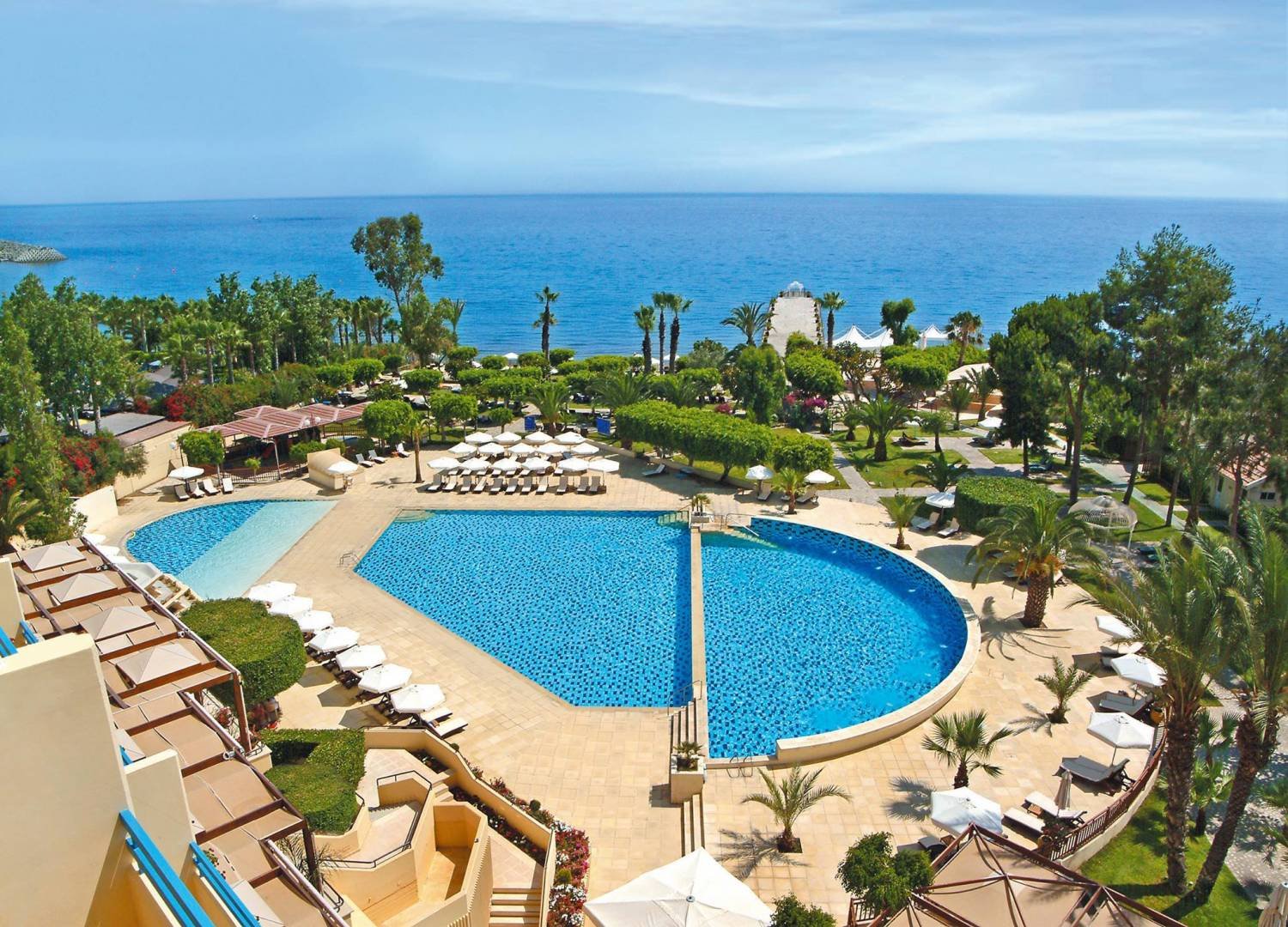 As you may know, the luxurious 4-star hotel is located in Limassol, on one of the most beautiful sandy beaches marked with the "Blue Flag". It is famous for its landscaped gardens, restaurants and bars by the sea. Weddings and special events are often held on the territory of the hotel.