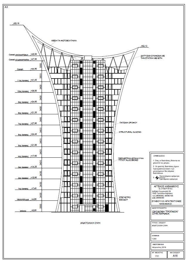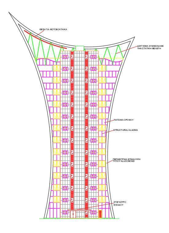 "TROPION" concerns a multi-storey building with 12 floors and 2 underground parking spaces. The height of the building will reach about 60m from the ground floor and includes two shops and a total of 22 offices (two on each floor), storage space, two underground parking spaces (34 parking of which 4 for the disabled), common areas, mechanical installations and green spaces.