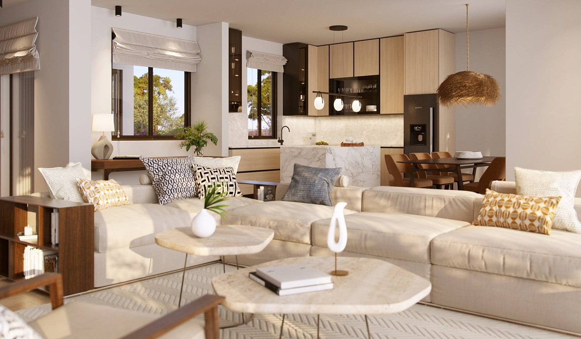 The villas are situated on large plots of land and feature three to six bedrooms. Thanks to the utilization of cutting-edge design solutions, the villas blend harmoniously with the surrounding landscape. The spacious interiors are in complete harmony with the adjacent gardens, creating a comfortable Mediterranean-style living experience.