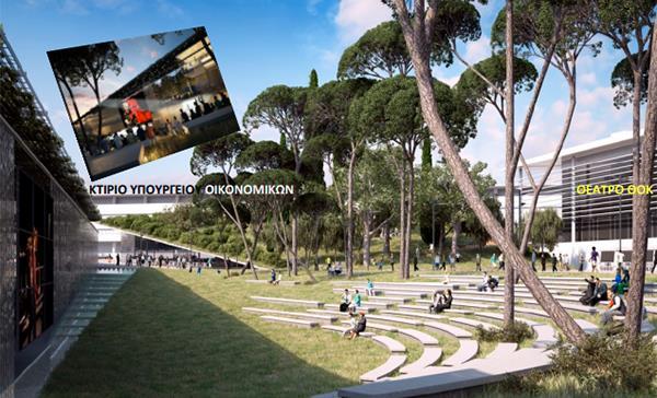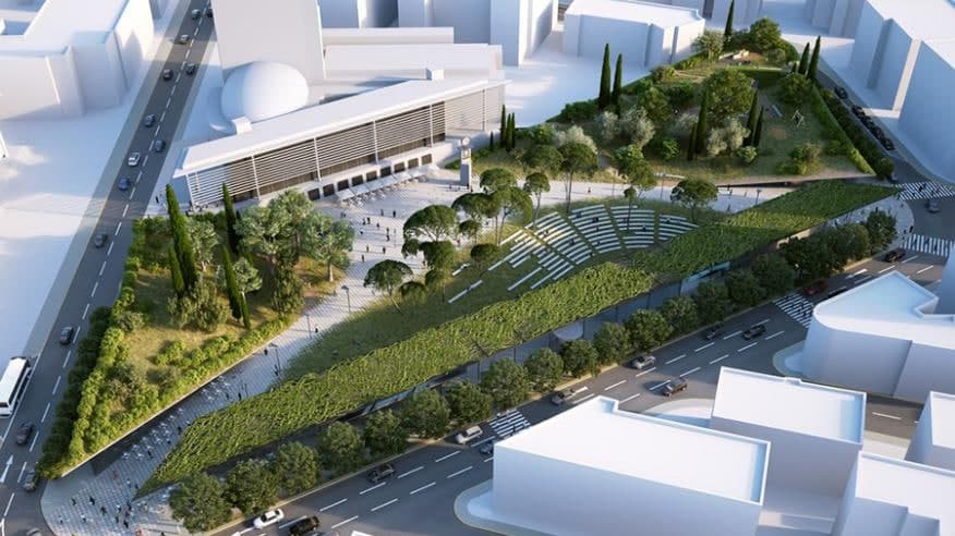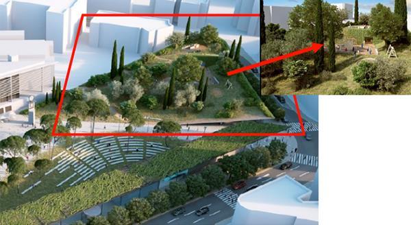 The entrance will be served by a two-lane ramp from Afxentiou Street and the exit from a two-lane ramp with ticket validation machines from Vassileos Pavlou Street. At the eastern end of the plot, one of the two elevations will be constructed, on which the "Mediterranean Hill" will be landscaped, which will host both the outdoor playground and the indoor playground.