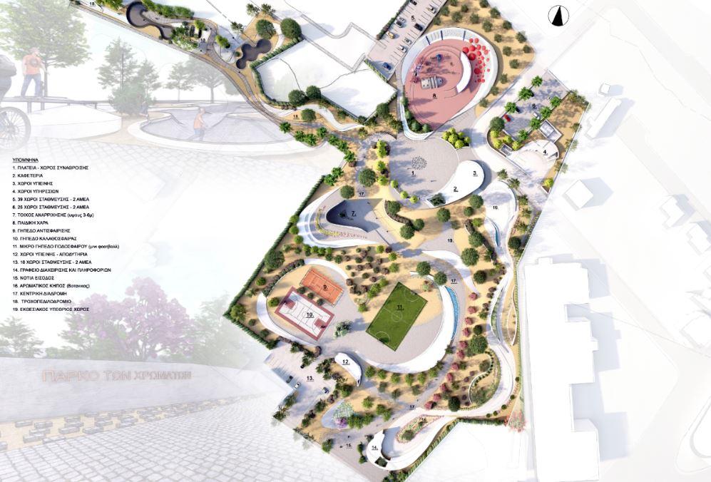 The "Park of Colors" covers an area of 32 thousand square meters, making it the largest urban park in Cyprus and the most "rich" on the island both in terms of greenery and infrastructure. Hundreds of new trees will be planted in the park, while it will include square gathering places, playground, cafeteria, tennis court, basketball court, small soccer field, locker rooms, roller coaster, skateboard, climbing wall for 3-6 meters, office space, aromatic-botanical garden, sanitary facilities, 83 parking spaces for the public and the disabled, service areas, the main route, and entrance gates.