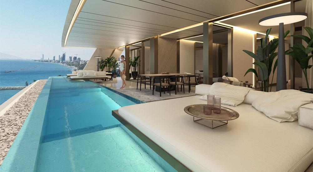 In addition to two low-rise buildings and a gated community of villas, the hotel complex will include a 24-story tower. It provides magnificent apartments with panoramic views of the Mediterranean Sea and the coast of Limassol,
