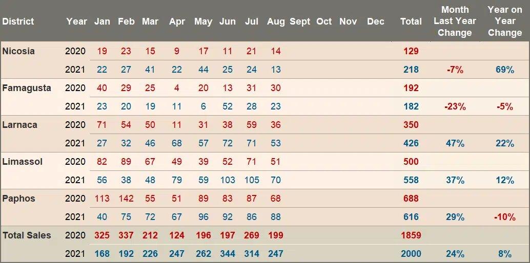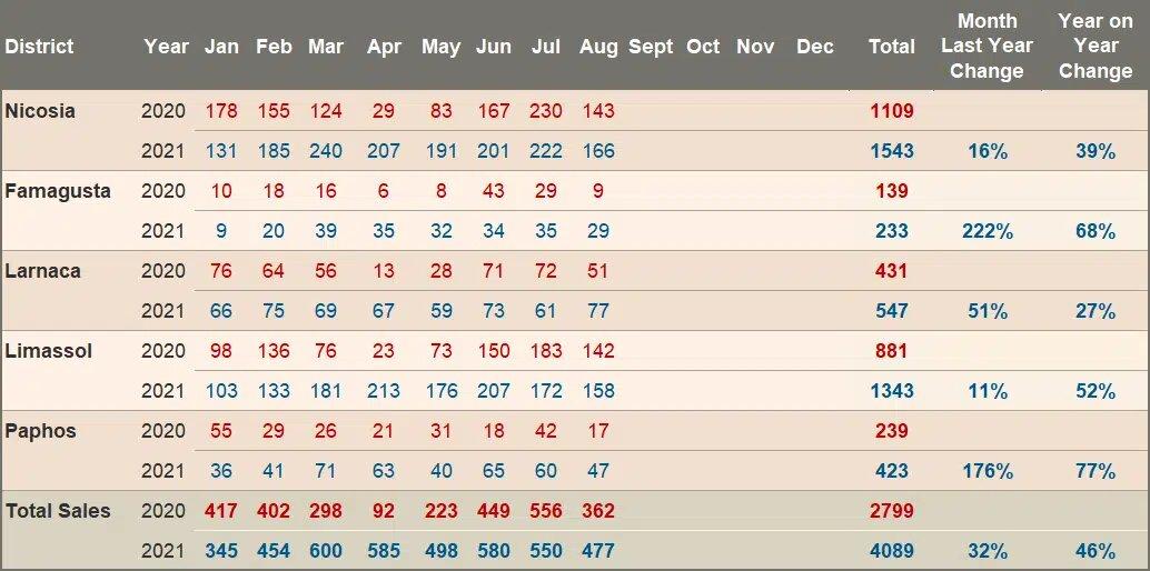 Sales to EU citizens rose 60% in August compared to the same period last year. At the same time, the number of transactions increased in all districts, except for Nicosia (-18%) and Larnaca (-12%). At the same time, in the first eight months of 2021, sales increased in all cities of Cyprus compared to the same period last year.