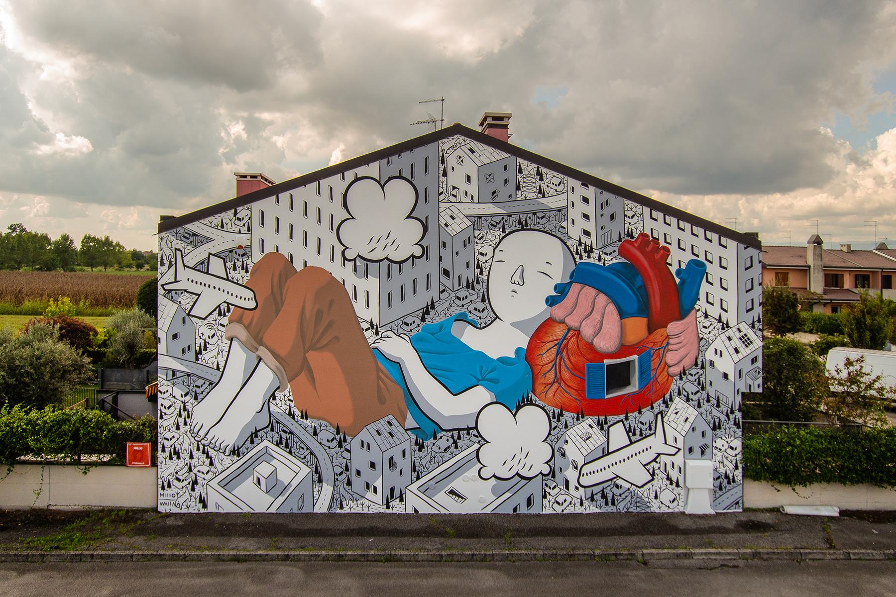 As a reminder, Francesco Camillo Giorgino (Millo) was born in 1979 in the town of Mezagna (Brindisi province). Even though he received a decent architectural education, actively engaged in street painting, so that very soon won recognition at the national level, winning the prestigious competition Premio Celeste, after which he took part in several street art festivals throughout Europe. His work has been seen in China, India, Australia, New Zealand, Canada, Thailand, Palestine, Jordan, UK, Cyprus, Georgia, Ukraine, Bosnia and Herzegovina, Russia, Belarus, Argentina, Chile, Bolivia, Mexico, France, Polynesia, Morocco, USA and all European countries. In addition, his artworks are also part of two permanent museum collections in Berlin and Amsterdam.