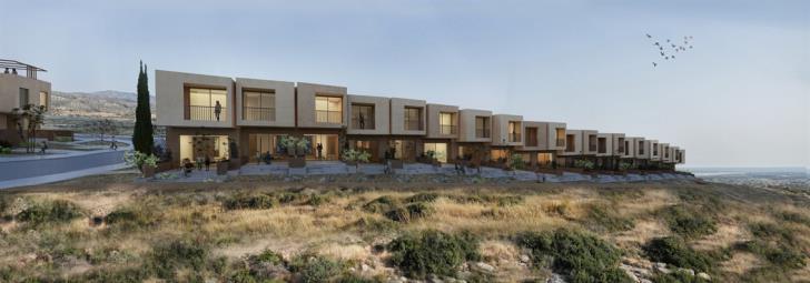 In block A, the houses are located across the road. Rectangular volumes form the complex with slight color variations in earth tones and coating textures, inspired by the traditional Cypriot architecture and the natural landscape, incorporating as a primary cell in each house a central which is the modern atrium.