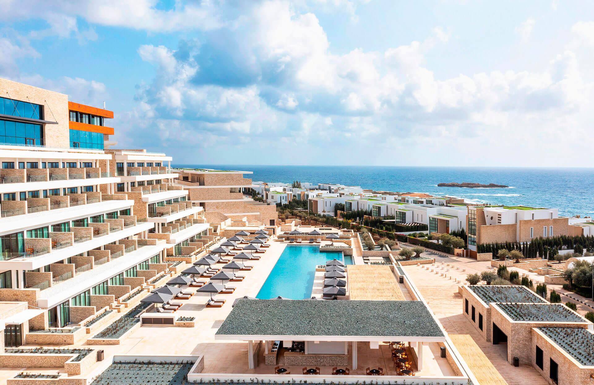 Chosen by Condé Nast Traveler editors as one of the best places for family vacations in Cyprus. The hotel is located on the seafront, surrounded by lush landscaped gardens, in the heart of Paphos, a 5-minute walk from the central promenade, the old fort, the famous House of Dionysus with its magnificent mosaics and stores. The hotel has a total of 189 rooms of the following categories: Inland View Room Terrace Garden, View Room Superior Sea View, Room Veranda Sea View, Room Terrace Sea View, Room Junior Suite Aethon Sea View, Room One Bedroom Suite, Two Bedroom Suite, Kyma Seafront Suite.
