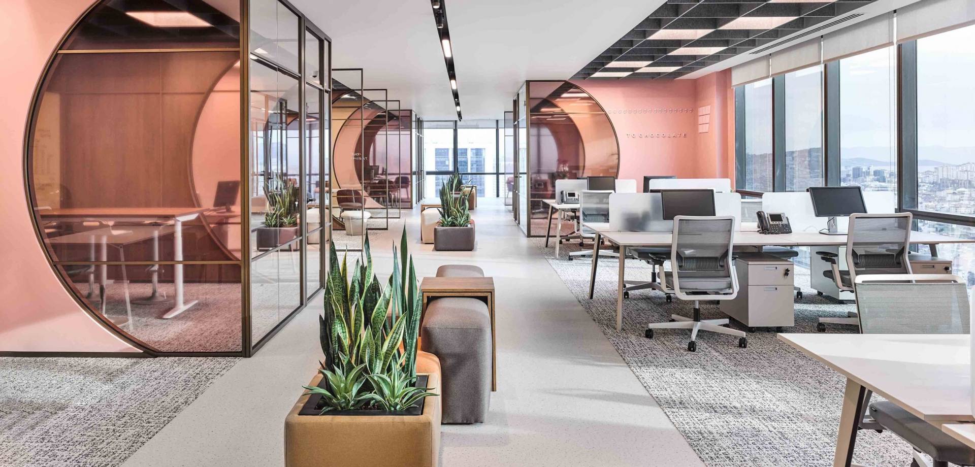 On each floor there will be: kitchens, toilets and covered verandas, meeting rooms and reception rooms. The building will be equipped with raised floors suitable for structured cabling and suspended ceilings with climate control units.