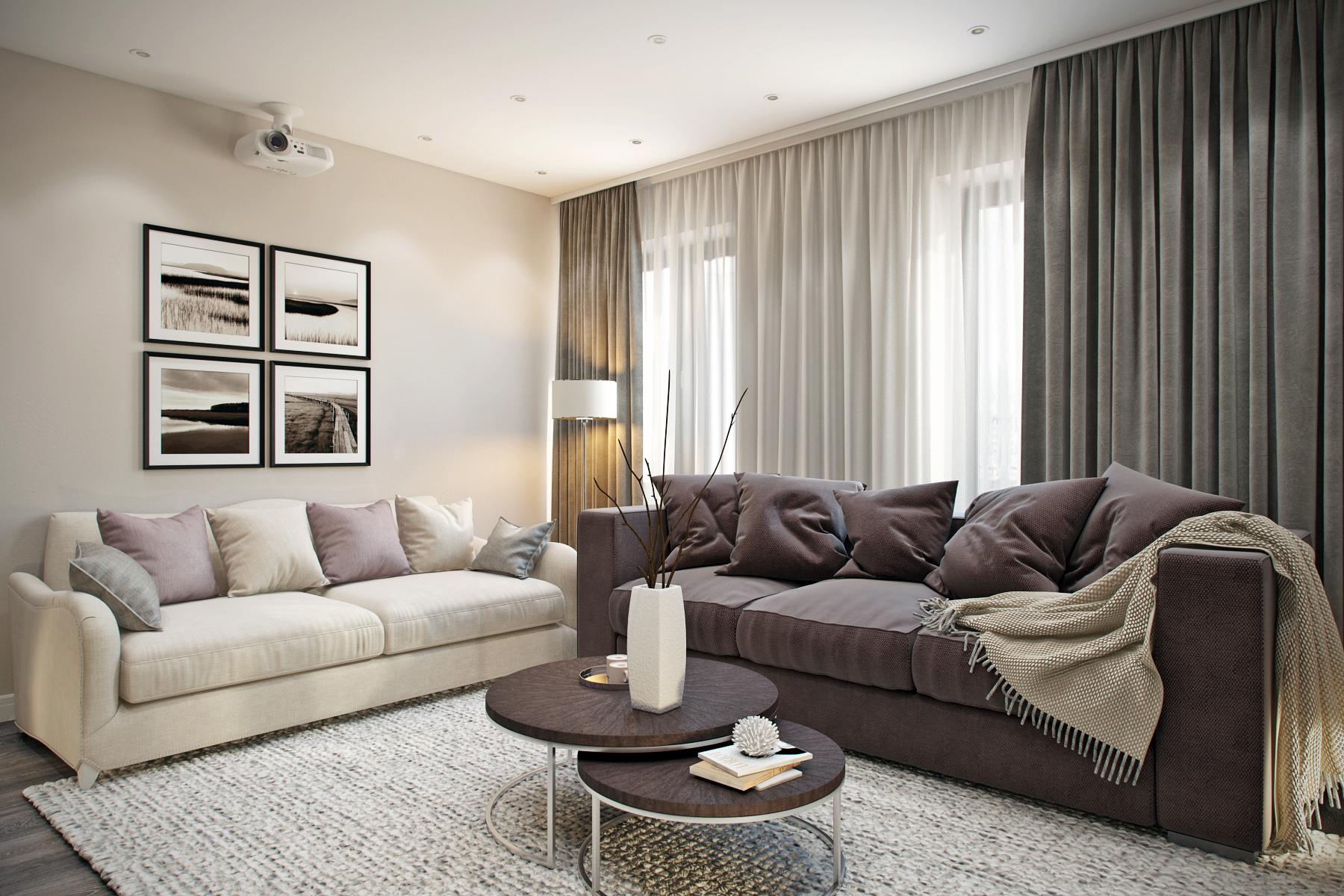 If the studio is spacious, you can experiment with transitions, textures, and different shades. However, in small spaces, it is better to prefer a combination of a base color and a bright shade. Light base colors will visually expand the room, and the bright color will add a touch of excitement to the interior. The combination of gray, white, and beige looks elegant. This warm, elegant, and unobtrusive trio makes a cramped room appear larger.