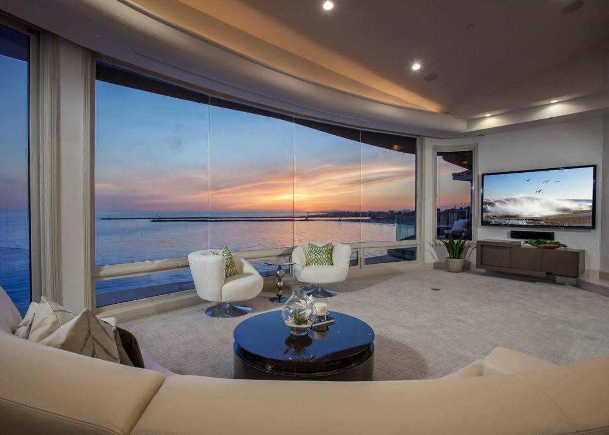 - A panoramic window is about airiness, about a large and free space. Therefore, you should not clutter up a room with such a window with large things and just an abundance of things. Choose non-massive sofas, furniture with thin legs - and strive for minimalism.