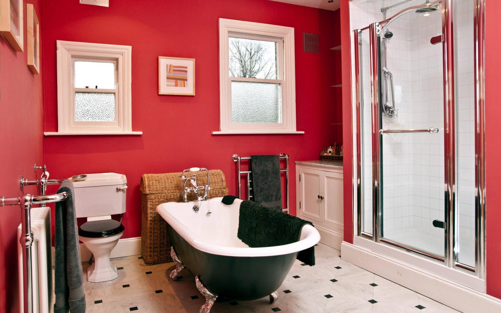 Even in a large bathroom, it is not worth making it entirely red. It is permissible to use large red elements (baths or shower cabins, furniture), but they should always be combined with some other color. For this, ivory-white, glossy black or glossy gray is suitable, and you can add a little silver or gold to this color scheme.