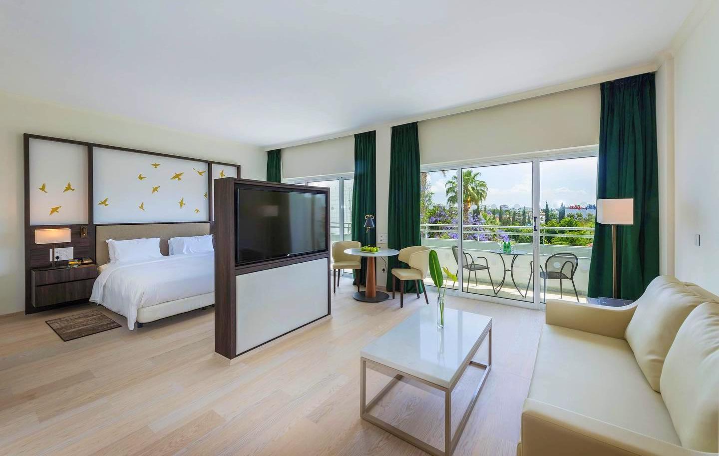 Exquisite style and commitment to light can be seen in all 194 rooms, from single to presidential suite. The rooms are decorated in pastel colors, panoramic glazing unites the interior space with wide terraces overlooking the landscaped park and swimming pool. Each room has comfortable marble bathrooms and prepared work areas. The hotel's restaurants and bars will satisfy the demand and appetite of the most demanding gourmets. Akakiko offers light Japanese cuisine, Olympia offers a varied menu of Cypriot and Mediterranean dishes. Visitors to the poolside bars Amalfi and Sorrento can look forward to a drink depending on their mood and time of day.
