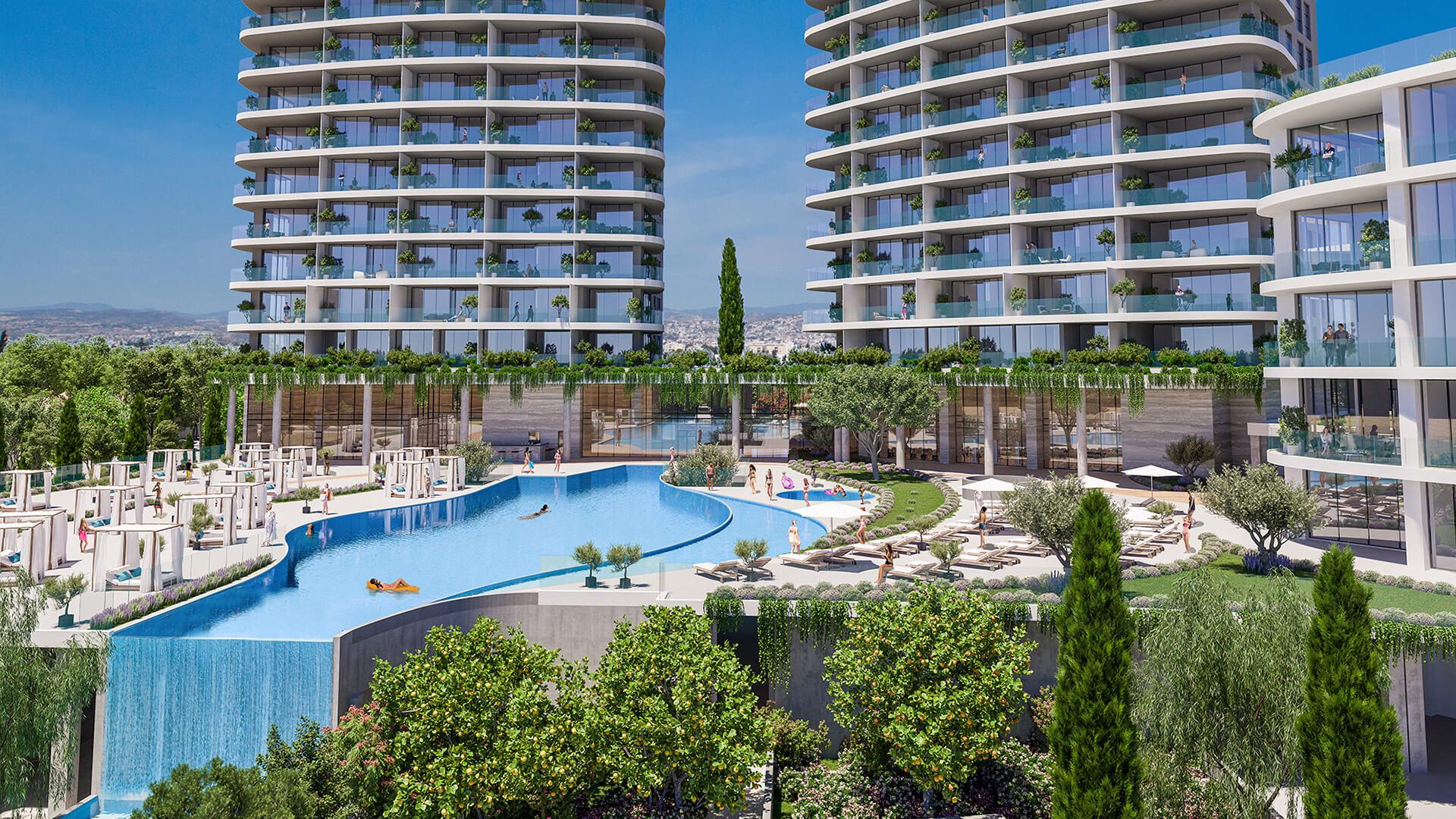 Another approach is the creation of a unified green space in large complexes. An example is Trilogy in Limassol, which features a complete park with greenery, walkways, recreational areas, and pools.