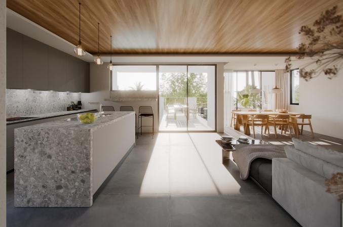 Все апартаменты имеют 2 или 3 спальни и обязательно – большую крытую террасу для отдыха. Внутри каждой квартиры предусмотрена просторная современная планировка и высококачественная отделка.