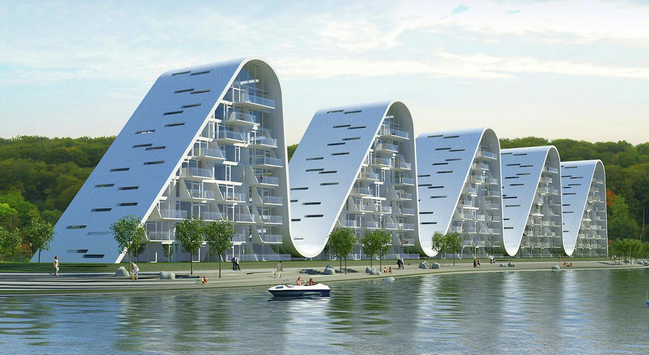 The Wave is an iconic residential development built in 2011 on the shores of Vejle Fjord. It was designed by renowned Danish architect Jorn Utzon, who was inspired by the famous Sydney Opera House. The construction of the five buildings, which resemble rough sea waves, was carried out in several stages, with an interruption caused by the global financial crisis in 2008. Each part of the complex is 9 storeys high, with two-storey penthouses at the top. Waves" are formed by terracotta panels that form the roofs. The total area of the building is 14 thousand m2, which accommodates 110 comfortable apartments.