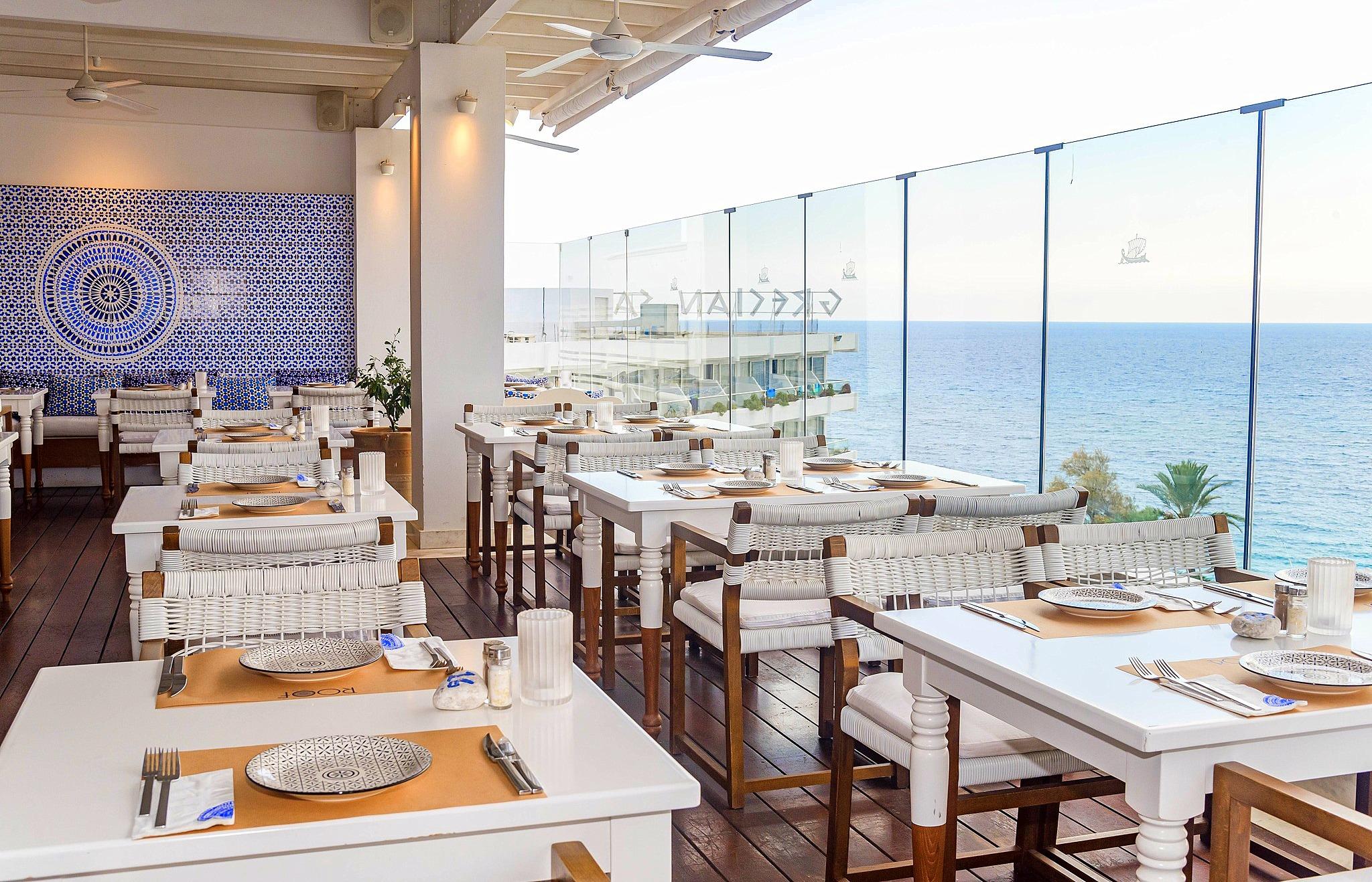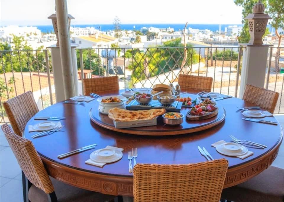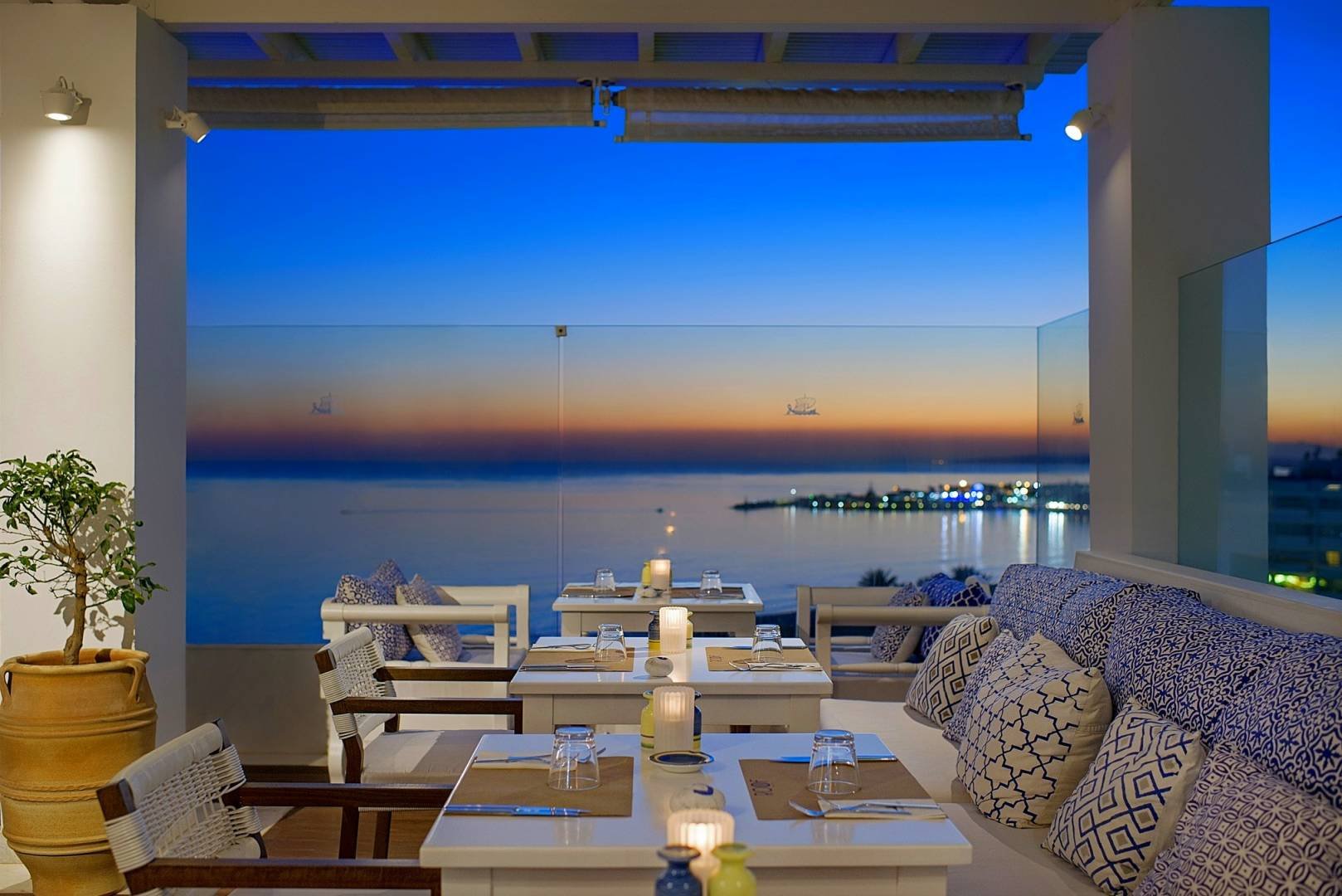 The bar is located on the top floor of the Grecian Sands Hotel, where you can enjoy the stunning panorama of the Mediterranean Sea. Experienced masters of culinary art will delight guests with appetizing burgers with different fillings, including vegetarian ones. Fries and fresh herbs are an obligatory addition. In addition, the menu is made up of international dishes, such as light salads, tacos with shrimps or quesadillas with pork.