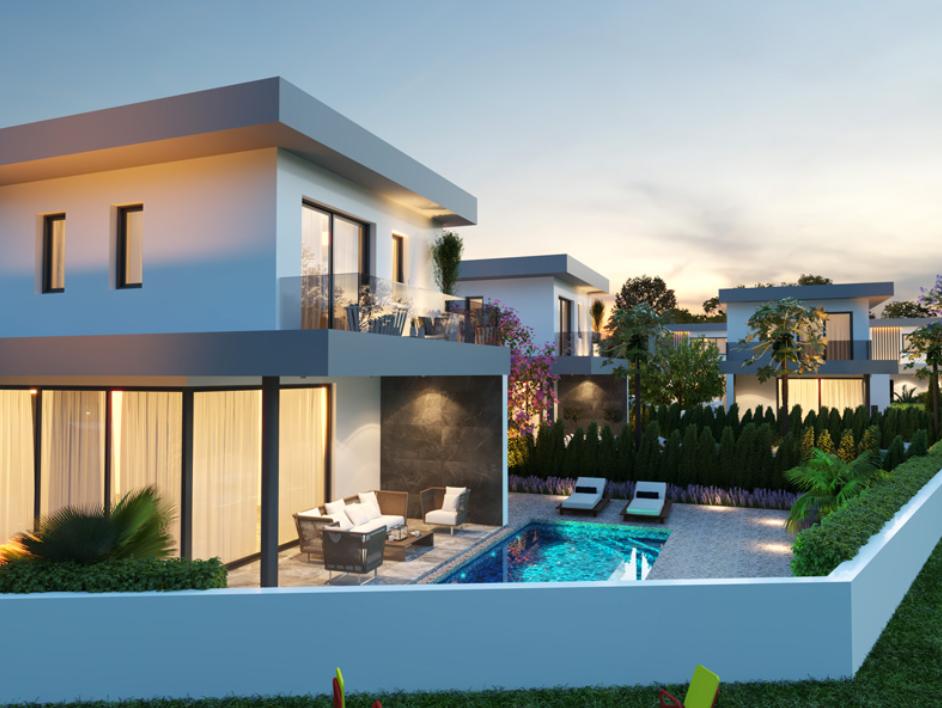Almyra Villas is a gated complex of 7 villas, you can choose both a double and a three–bedroom option. The latter is more spacious and free, the area of the house is 126 m2, excluding the terrace and outdoor areas. The land plot occupies almost 300 m2.