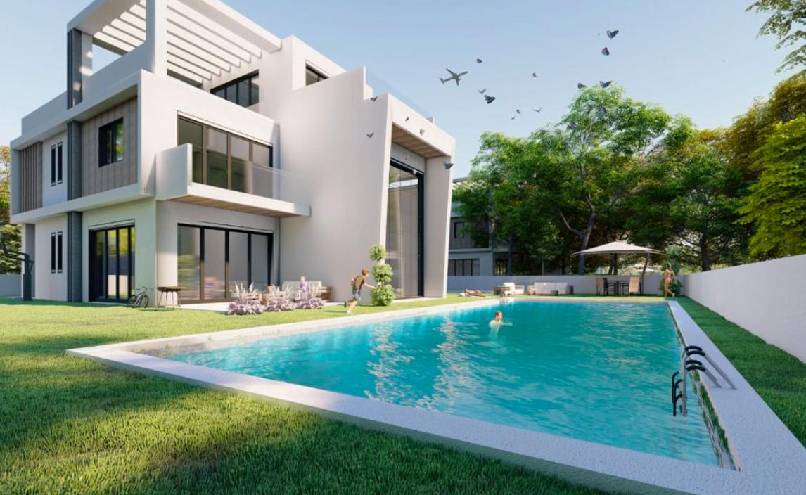 The four-bedroom villa covers an area of 175 m2 and has 4 bathrooms, a living room with an open-plan kitchen, balconies on the 2nd floor and a rooftop bar. In the landscaped garden there is a swimming pool, a barbecue area and a place for children's games.