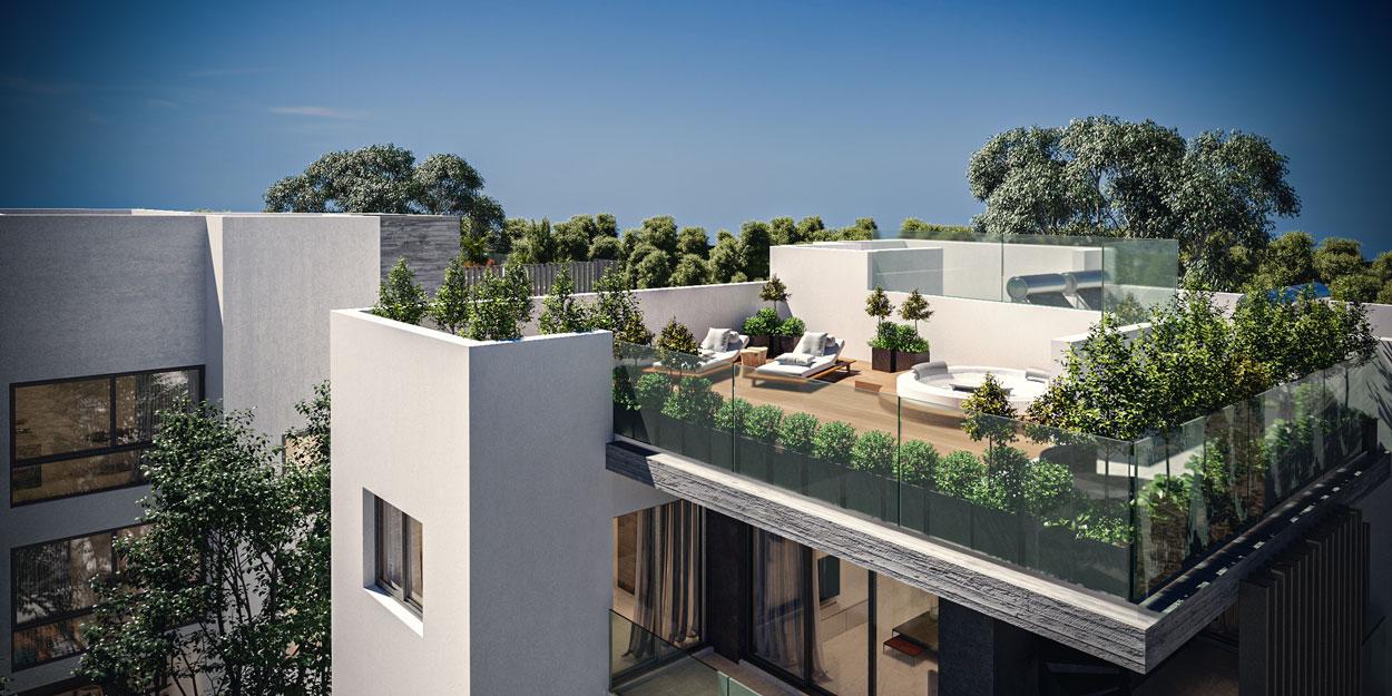 The penthouses deserve special attention. They not only offer fantastic views but also have their own rooftop gardens. If desired, a pool and a superb relaxation area can be set up there.