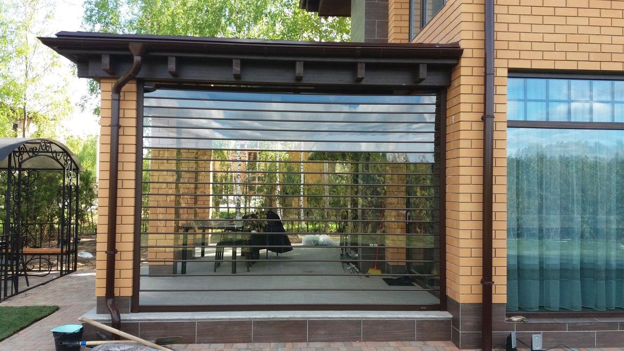 This is one of the first options that comes to mind and which protects immediately from all external negative factors: sun, rain, wind, insects, birds, dust. Unlike any other type of glazing, frameless glazing looks very aesthetic and does not take up space.
