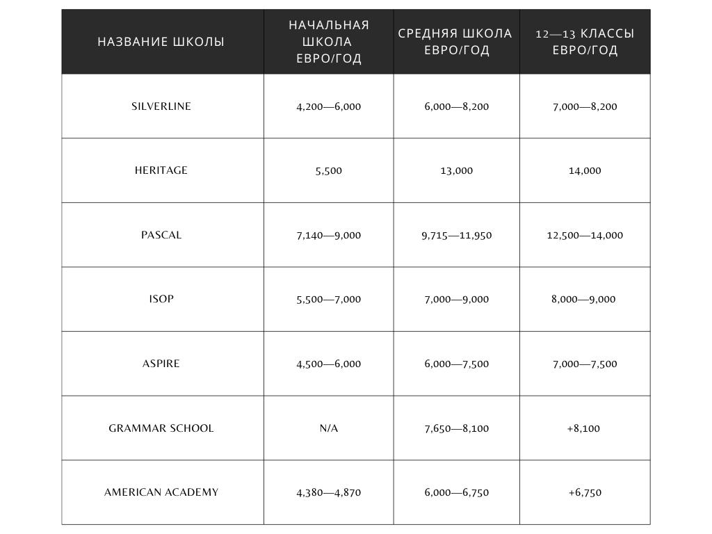 Плата за частное обучение обычно колеблется от 7,5 тысяч евро до 12,5 тысяч евро в год. Дополнительные расходы, включая экзамены, регистрационные сборы и внеклассные занятия, могут составлять еще 1,5—5 тысяч евро в год в зависимости от уровня школы. Таким образом, общие расходы в среднем составляют 9,350—16,350 евро в год.