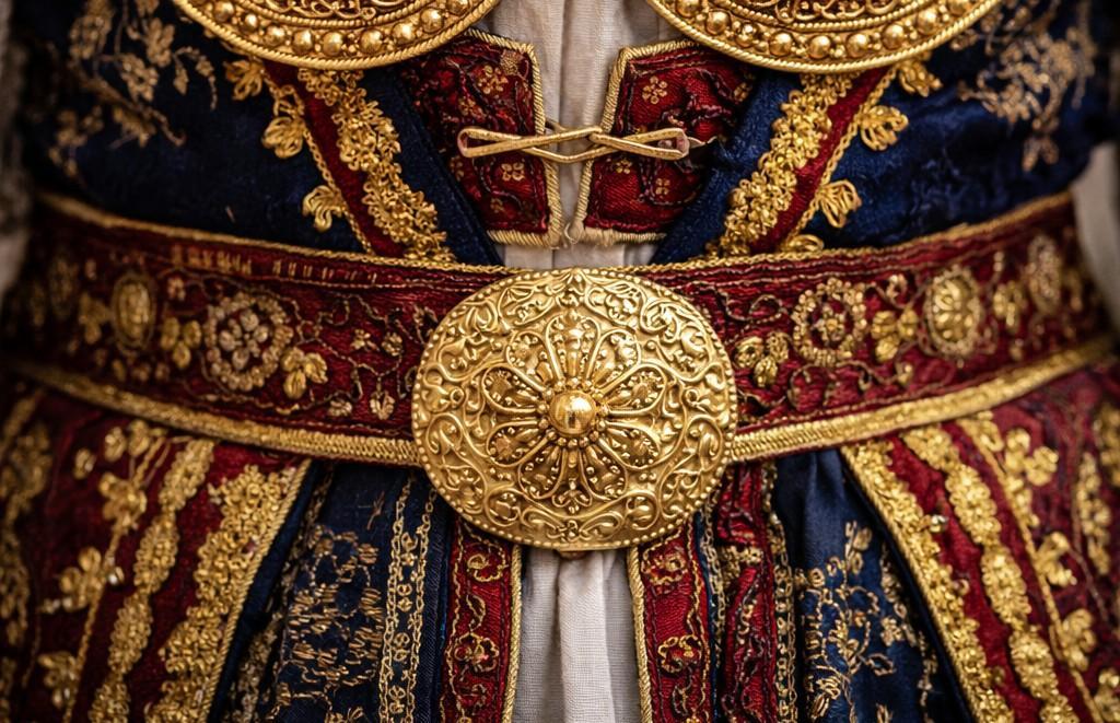 Large decorative buckles also form a part of a traditional women’s folk costume. Large and chunky, they were made out of solid gold, and, sometimes, silver. Such buckles are beautifully decorated with patterns in repoussé and chasing techniques. Some of the most common symbols included: Byzantine double-headed eagle, a «tree of life», birds or animals and floral patterns. A buckle was a central part of the woman’s outfit and served as a powerful status symbol and a protective element.