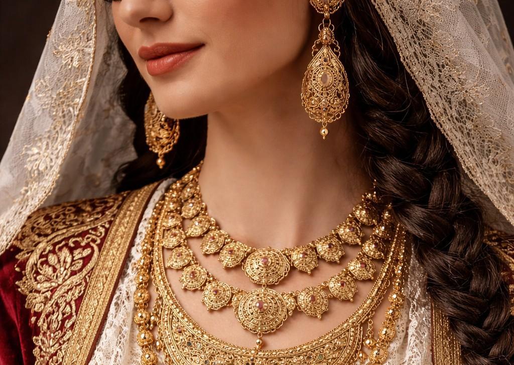 The woman, especially the bride, would wear multiple jewellery pieces for protection. It was believed that earrings would fend away spells from her ears, the headpiece would guard the mind, the bracelets would protect the limbs, the belt would safeguard her fertility and the necklace would shield her vitality from possible spiritual attacks.