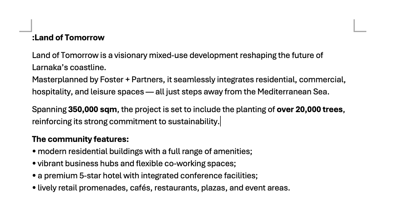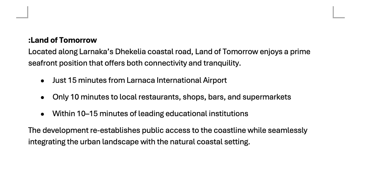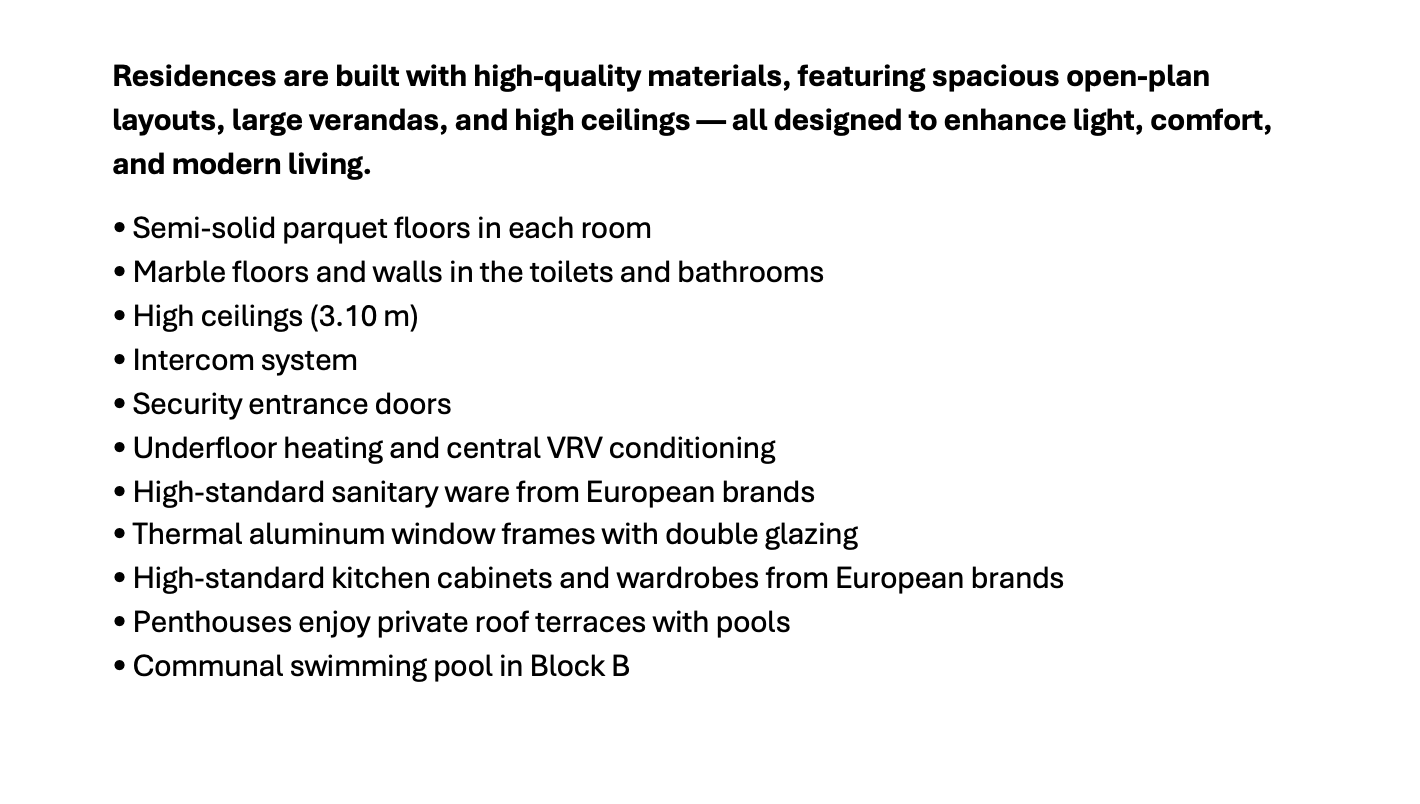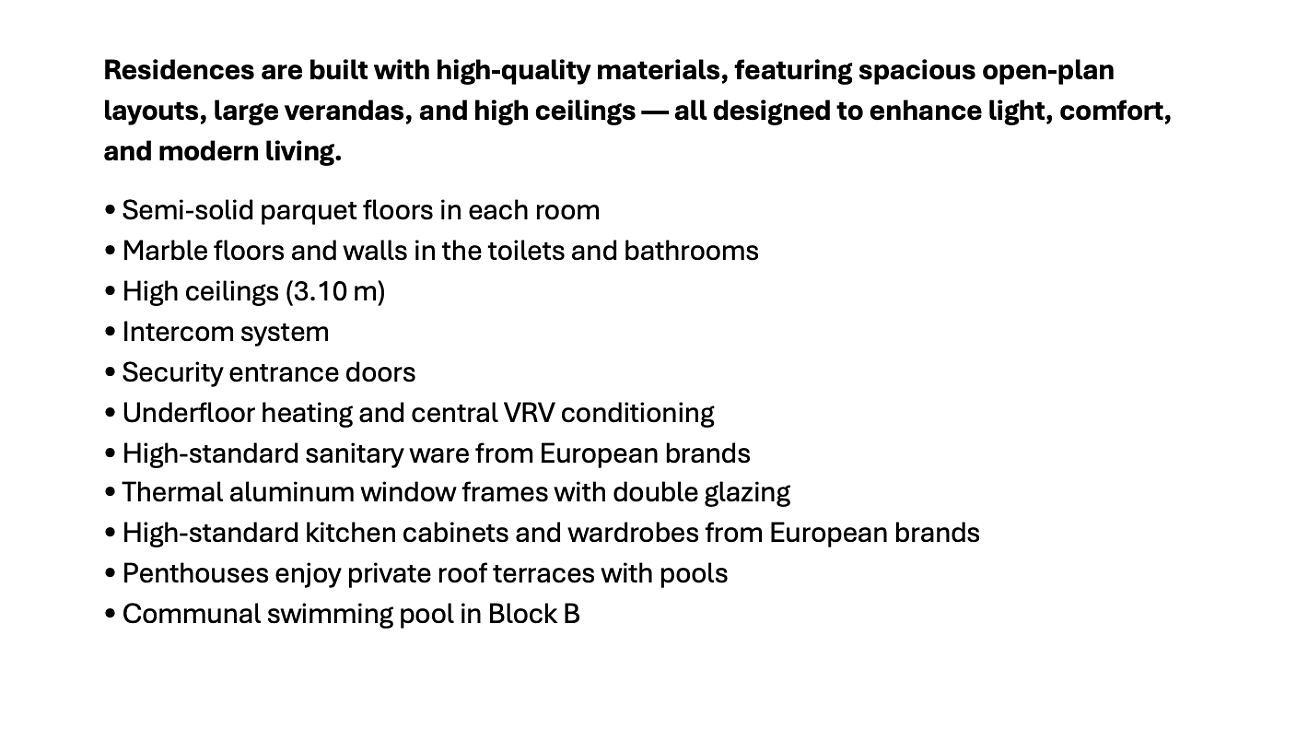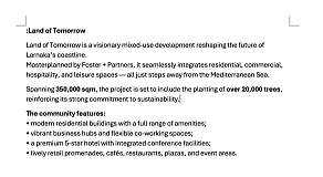 Новый комплекс в районе Land of Tomorrow, Larnaca, который предлагает множество вариантов проживания: от квартир с 1–3 спальнями до роскошных пентхаусов. Комплекс сочетает в себе высококлассный дизайн, отделку и последние тенденции с использованием высококачественных теплоизоляционных материалов и сантехники.