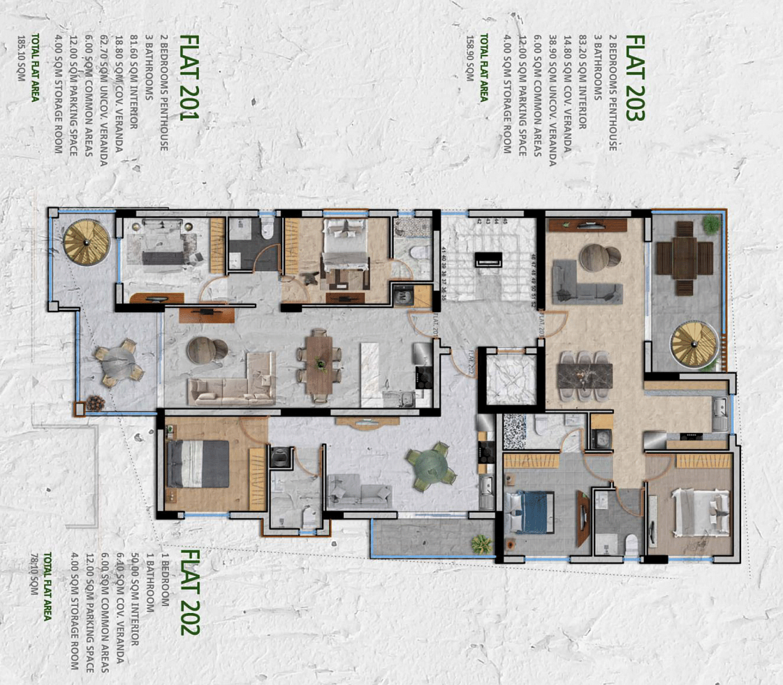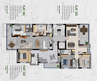 Квартиры в комплексе отличаются просторными гостиными с кухнями открытого плана, светлыми спальнями и современными ванными комнатами. Для удобства предусмотрены крытые веранды, кладовые помещения и собственные парковочные места.