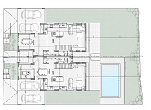 На первом этаже каждого дома расположены просторная гостиная, кухня и столовая, гостевой туалет с душем, а также двойной крытый гараж. По желанию покупателя возможно обустройство отдельного офисного помещения, что особенно удобно для работы из дома. Планировка первого этажа продумана таким образом, чтобы обеспечить максимальный комфорт в повседневной жизни.