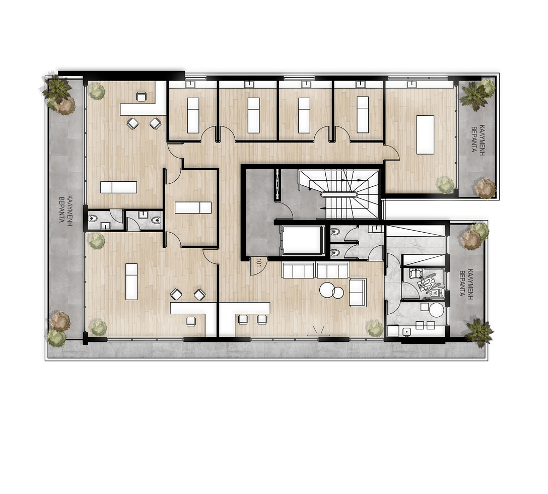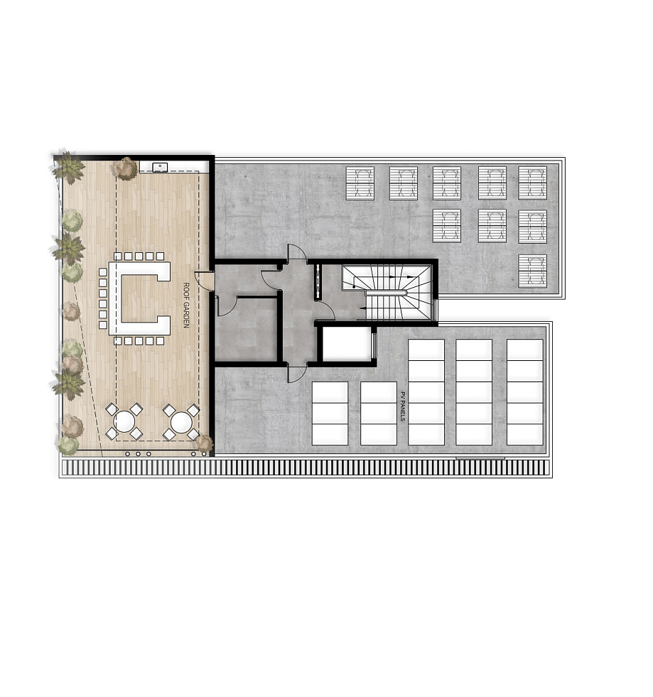 В комплексе предусмотрены все условия для комфортной работы: большие веранды, парковочные места, системы термо- и звукоизоляции, подготовка под кондиционирование воздуха и установка видеонаблюдения. Особое преимущество проекта — общая терраса на крыше площадью 118 м², идеально подходящая для отдыха.