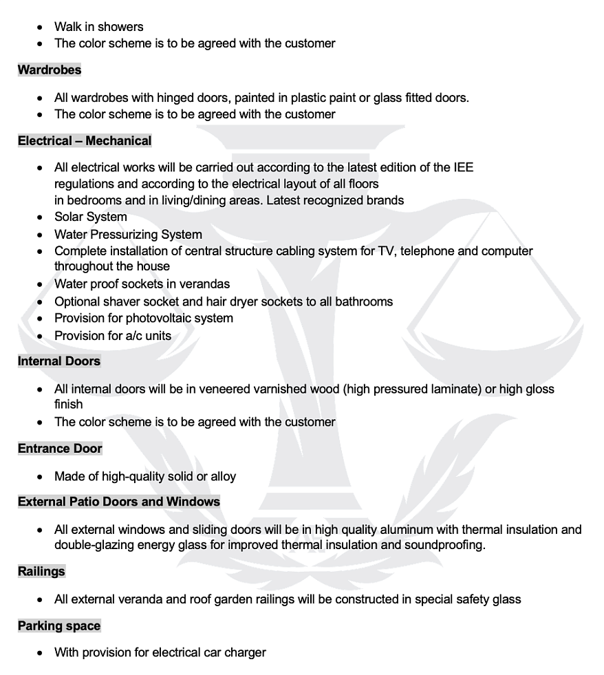 Проектом предусмотрена установка системы напора воды, внешняя теплоизоляция, есть ламинат в спальнях, подвесные потолки, теплый пол, система кондиционирования воздуха Freematch -VRV, сигнализация, электрические ворота. Кроме того, имеется возможность подключения фотоэлектрической системы. На территории имеется частный бассейн. Энергетический сертификат класса A. Есть также парковочное место с возможностью подключения электромобиля.