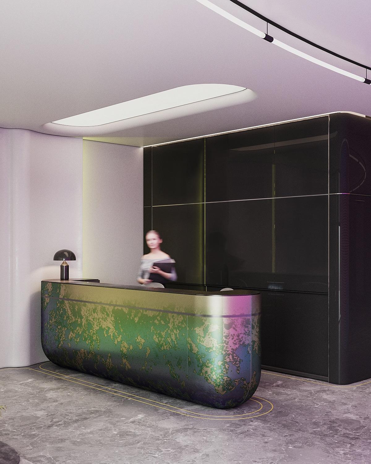 На первом уровне предусмотрена стойка регистрации с современным письменным столом, пышными растениями в стильных каменных горшках и удобными креслами для гостей, а также звукоизолированные конференц-залы.