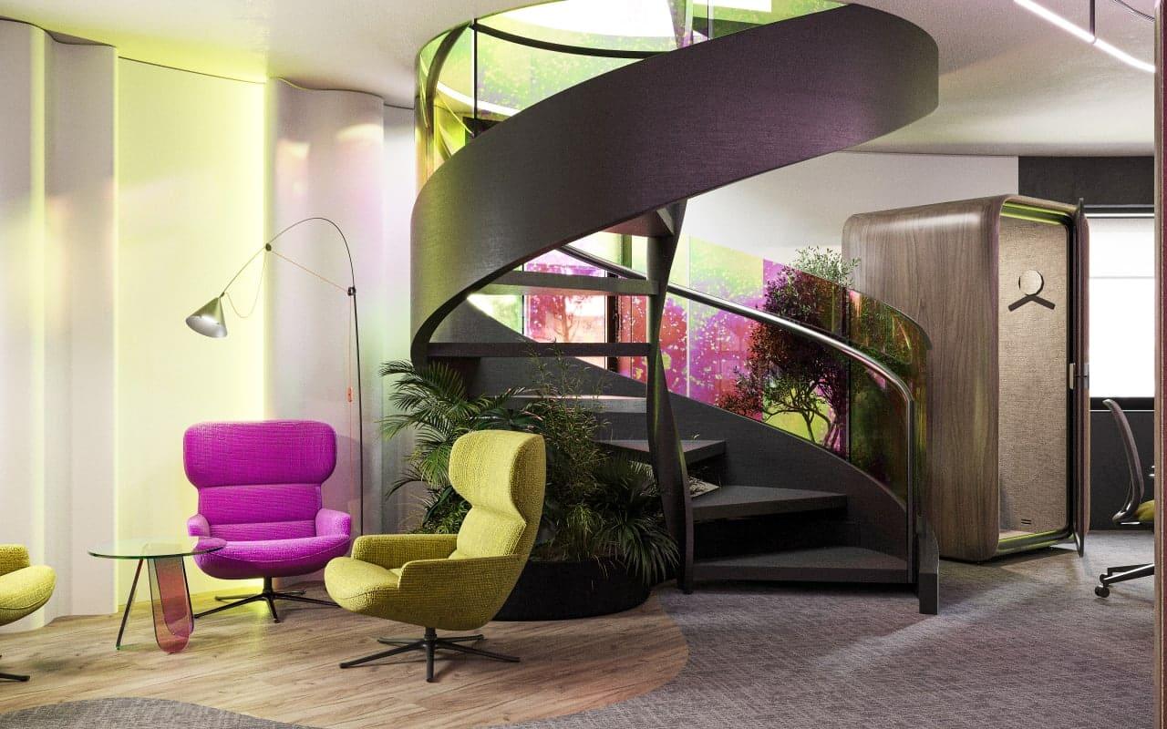 Стоит отметить, что некоторые зоны будут многоцелевые. Например, холл на первом этаже можно будет легко трансформировать в коворкинг. Главным акцентом интерьера станет внутренний атриум с ландшафтным дизайном: стеклянный цилиндр, в который заключен пышный оазис.