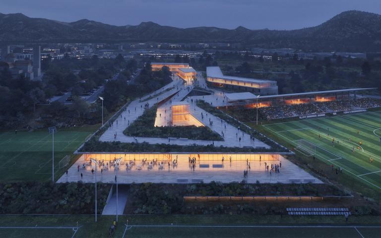 Новый спортивный центр для КОП включает футбольные поля со всеми сопутствующими помещениями, офисное здание и другие вспомогательные учебные и гостиничные объекты, соединенные между собой площадью с ландшафтной зоной.