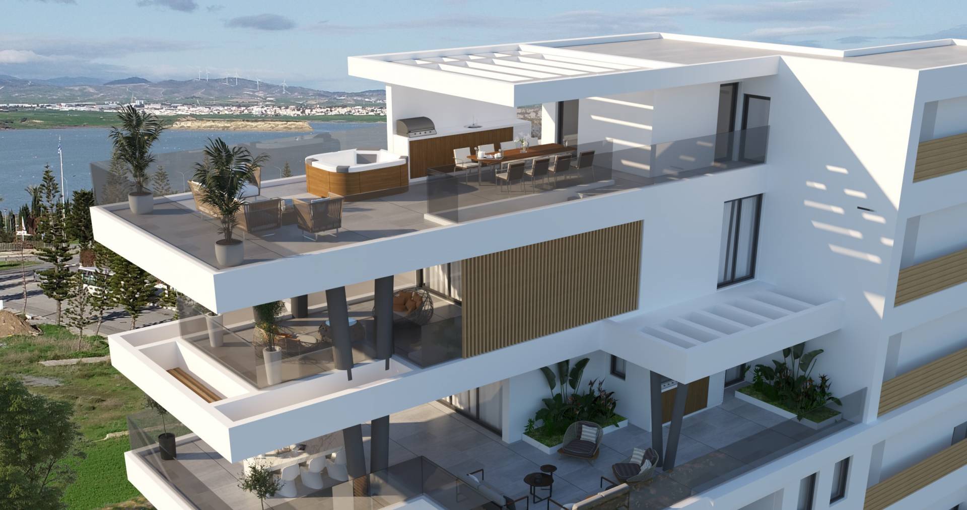 Жильцы роскошного пентхауса получат доступ на крышу где будет оборудован roof garden и место для барбекю с потрясающим панорамным видом на море.