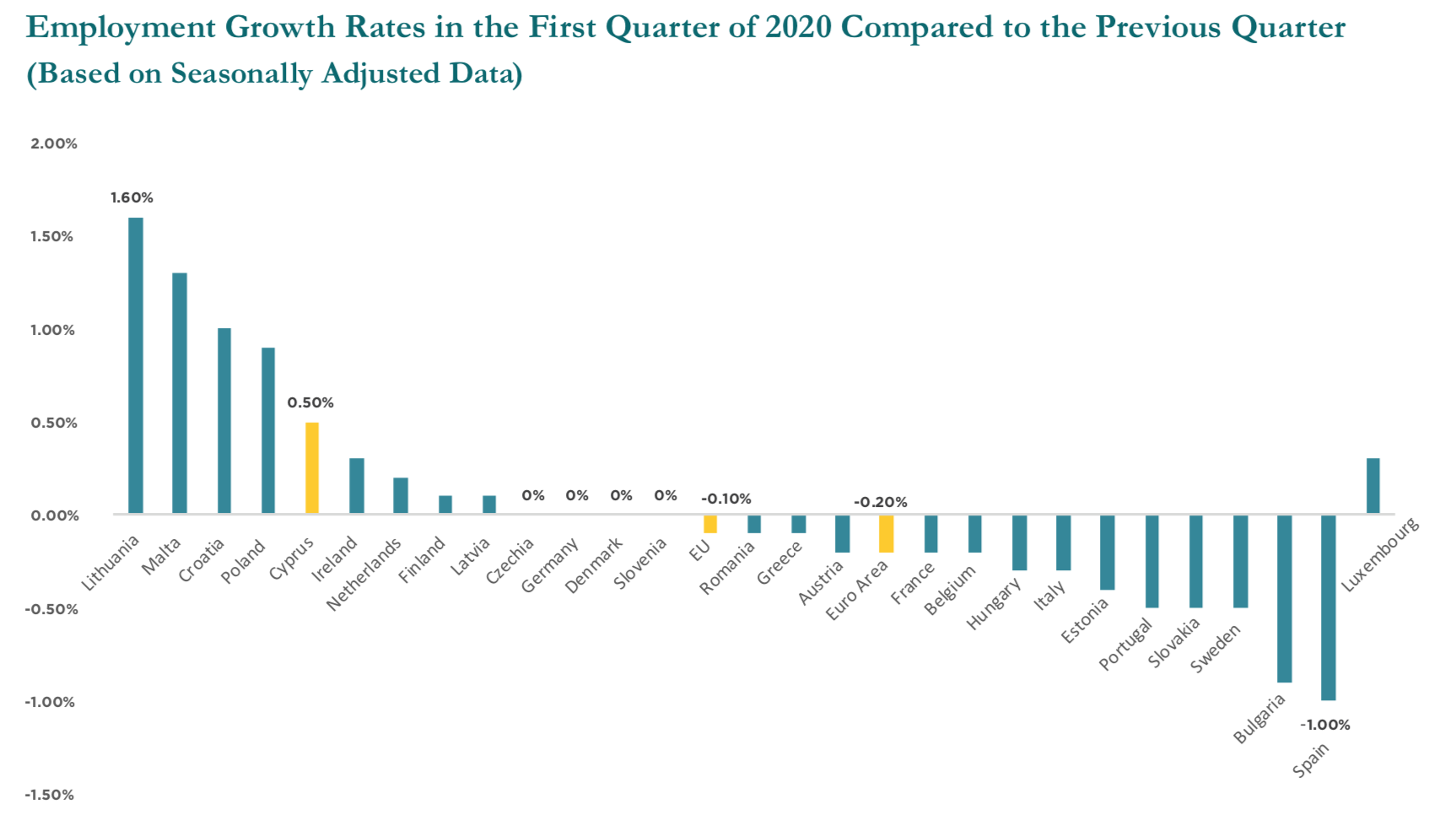 Кроме того, согласно отчету, Кипр занимает третье место в Еврозоне по темпам роста занятости за первые три месяца 2020 года, зафиксировав ежеквартальное увеличение на 0,5%.