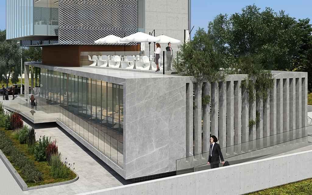 Проект также предусматривает ресепшн, тренажерный зал и кафетерий на первом этаже. Для удобства сотрудников рядом с высоткой оборудуют просторный паркинг для машин на 35 мест, а также парковочные места для велосипедов и красивый сад.